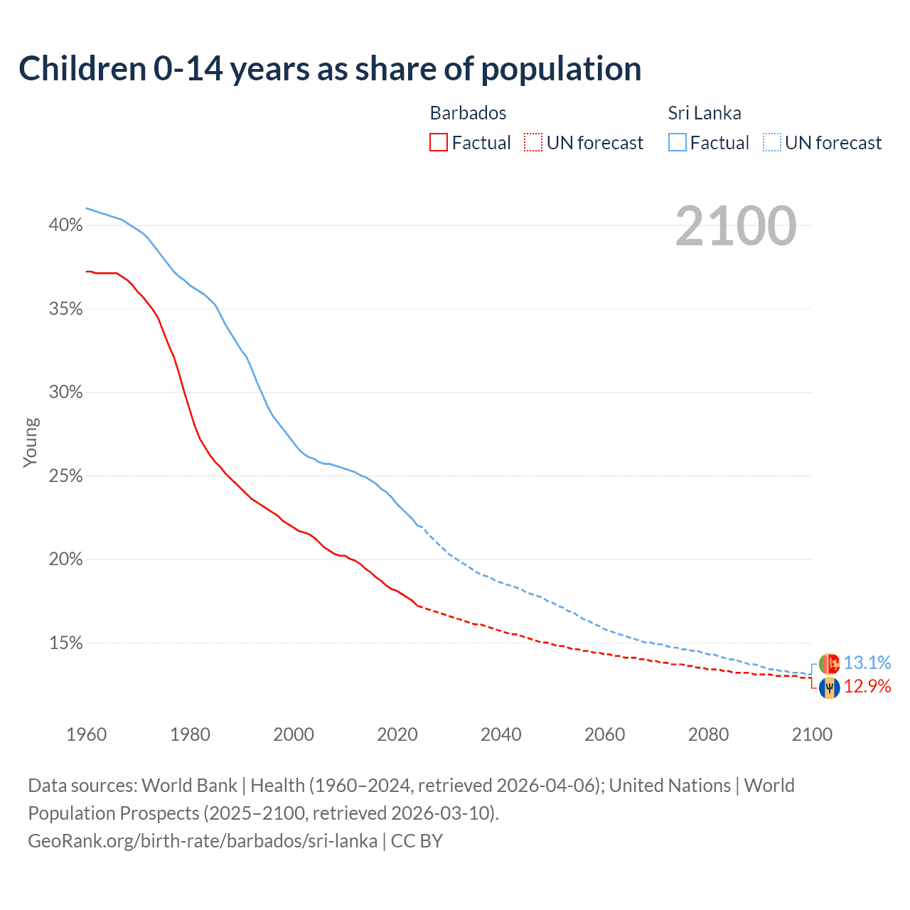 According to the latest available data on birth rates, the fertility rate in Barbados was 1.71 children per woman in 2023, compared to 1.97 in Sri Lanka in 2023. The replacement level is considered to be 2.1 children per woman.