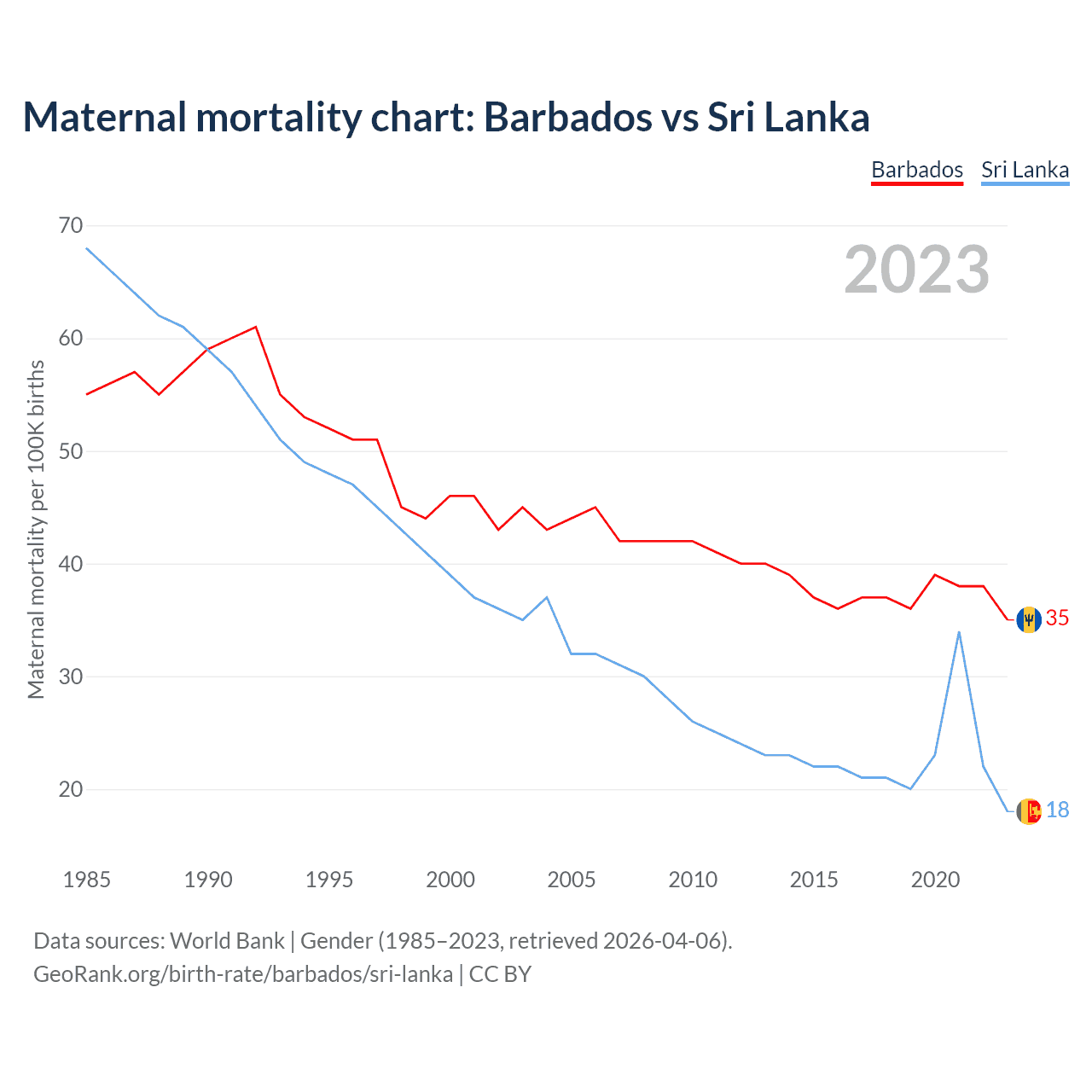 The maternal mortality rate, which is the probability of dying during childbirth or within 42 days of pregnancy termination, is 35 deaths per 100,000 live births in Barbados, compared to 18 deaths in Sri Lanka.