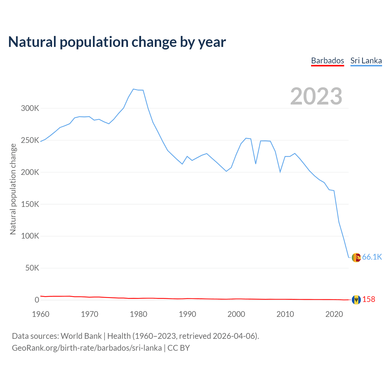 Barbados has an annual birth rate of 11.2 births per 1,000 people, compared to 11.2 for Sri Lanka. The average number of children a woman is expected to have during her lifetime — the fertility rate, is 1.71 in Barbados and 1.97 in Sri Lanka — 15.6% difference.