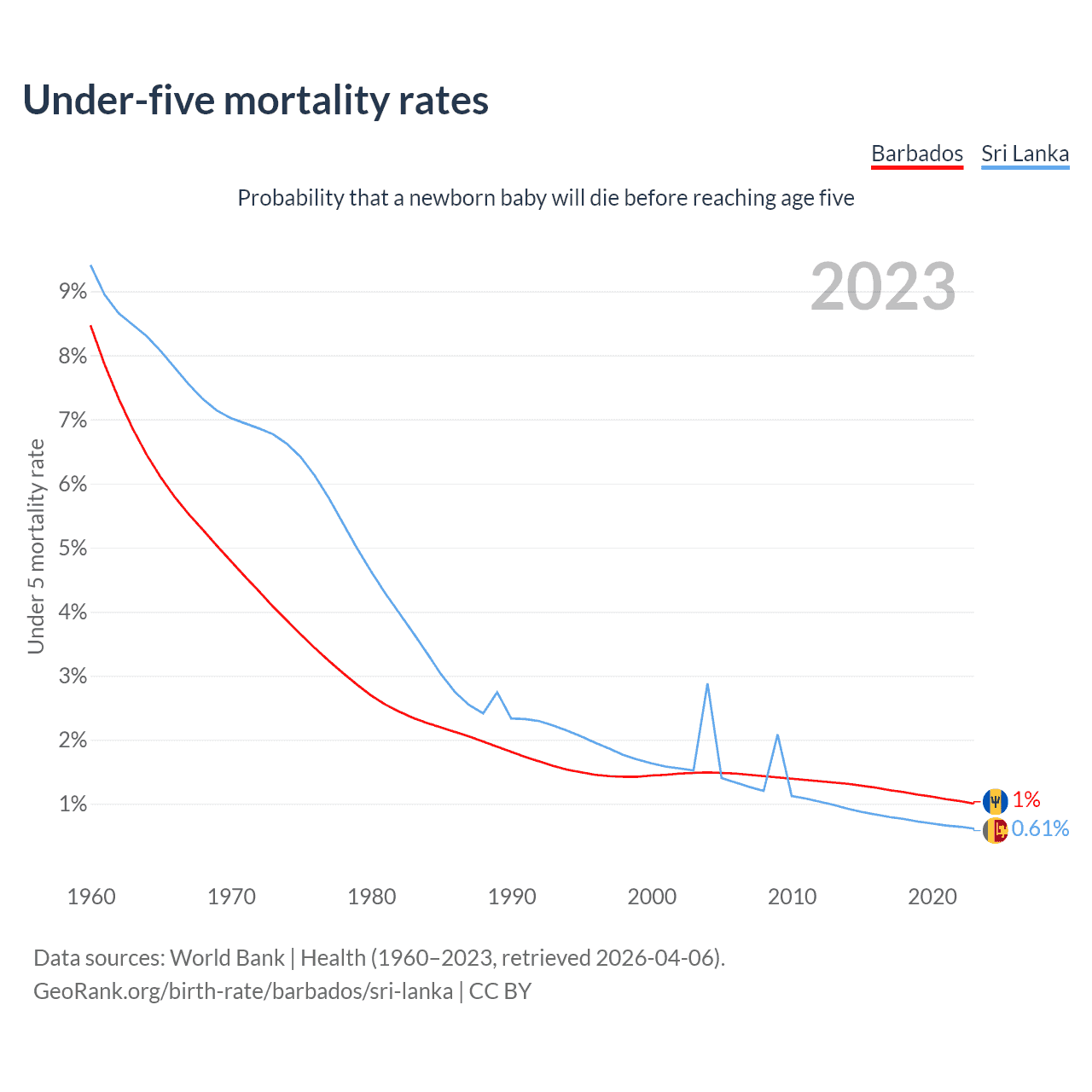 The chance that a newborn baby will die before reaching age five is 1% in Barbados and 0.61% in Sri Lanka. Above is a chart with historical data on under-five mortality rates.
