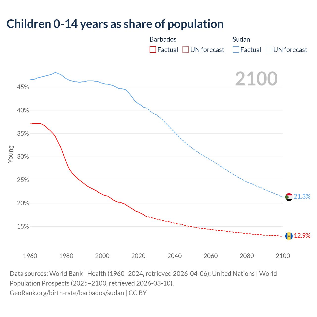 Barbados has an annual birth rate of 11.2 births per 1,000 people, compared to 33.6 for Sudan. The average number of children a woman is expected to have during her lifetime — the fertility rate, is 1.71 in Barbados and 4.32 in Sudan — 153.1% difference.