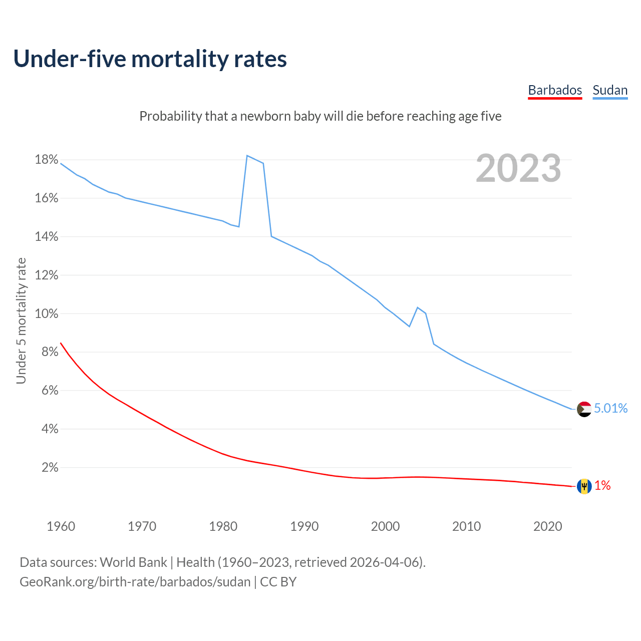 The chance that a newborn baby will die before reaching age five is 1% in Barbados and 5.01% in Sudan. Above is a chart with historical data on under-five mortality rates.