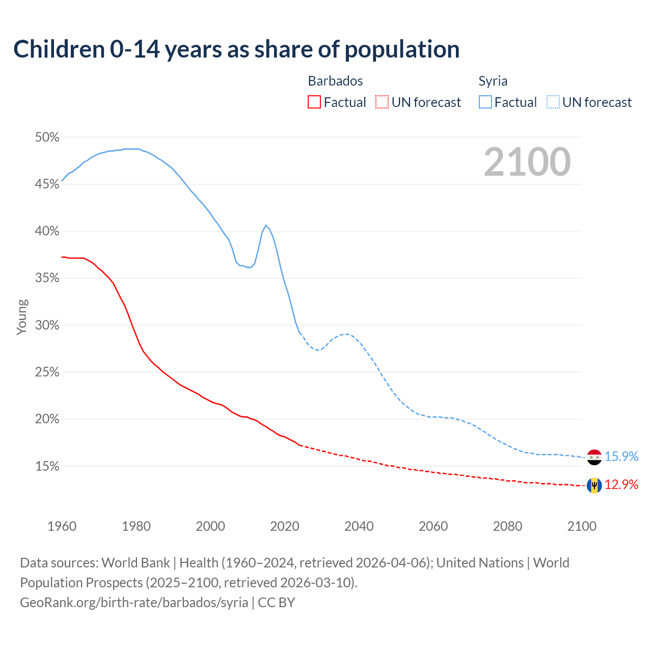 Barbados has an annual birth rate of 11.2 births per 1,000 people, compared to 22.1 for Syria. The average number of children a woman is expected to have during her lifetime — the fertility rate, is 1.71 in Barbados and 2.71 in Syria — 58.8% difference.