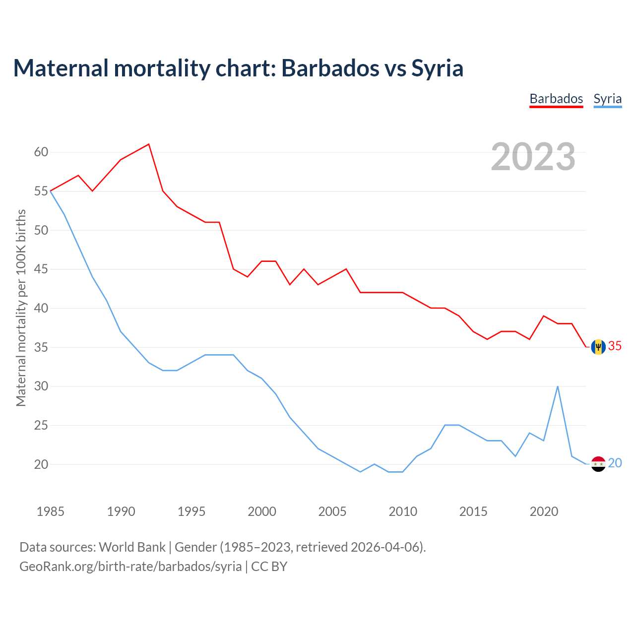 The maternal mortality rate, which is the probability of dying during childbirth or within 42 days of pregnancy termination, is 35 deaths per 100,000 live births in Barbados, compared to 20 deaths in Syria.