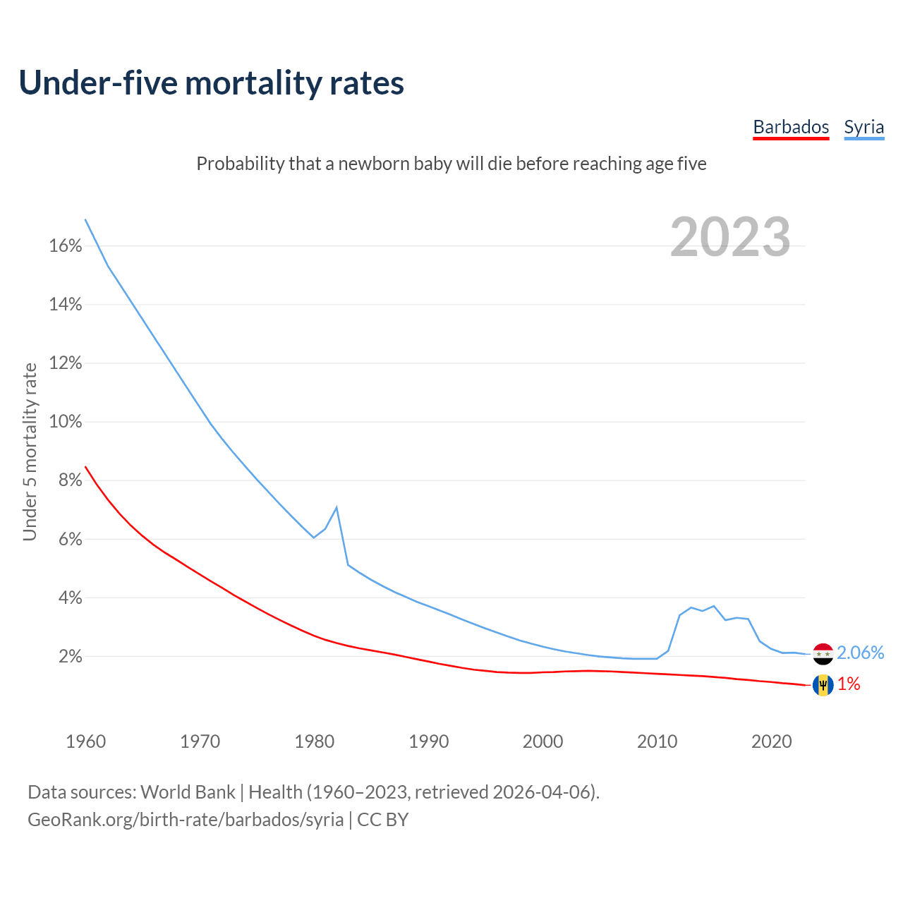 The chance that a newborn baby will die before reaching age five is 1% in Barbados and 2.06% in Syria. Above is a chart with historical data on under-five mortality rates.