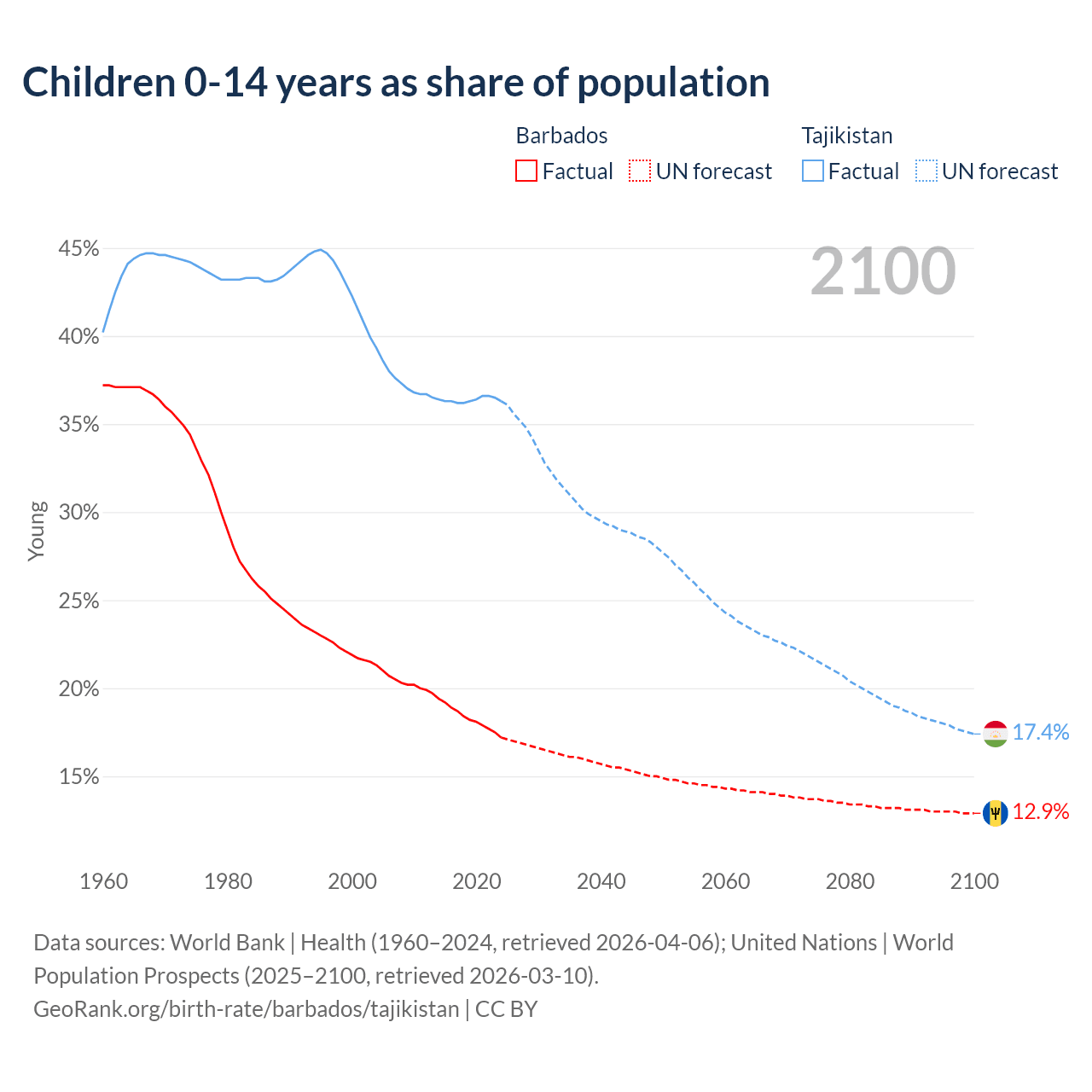 According to the latest available data on birth rates, the fertility rate in Barbados was 1.71 children per woman in 2023, compared to 3.07 in Tajikistan in 2023. The replacement level is considered to be 2.1 children per woman.