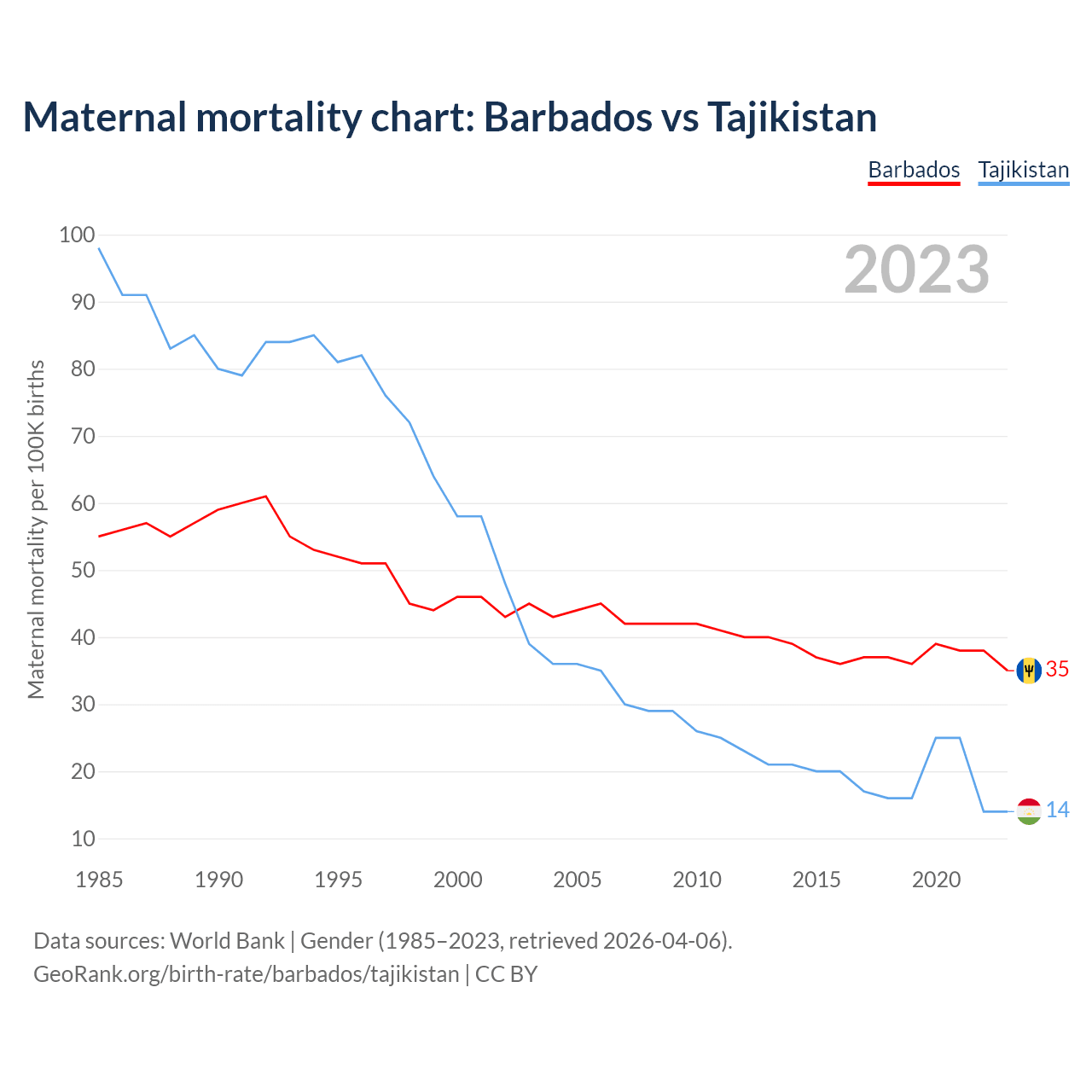 The maternal mortality rate, which is the probability of dying during childbirth or within 42 days of pregnancy termination, is 35 deaths per 100,000 live births in Barbados, compared to 14 deaths in Tajikistan.