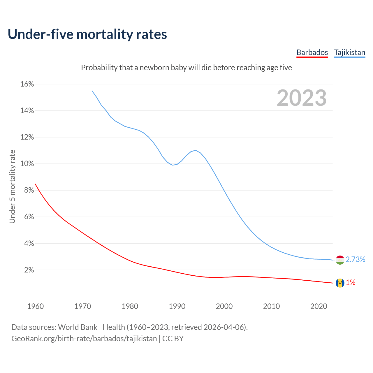 The chance that a newborn baby will die before reaching age five is 1% in Barbados and 2.73% in Tajikistan. Above is a chart with historical data on under-five mortality rates.