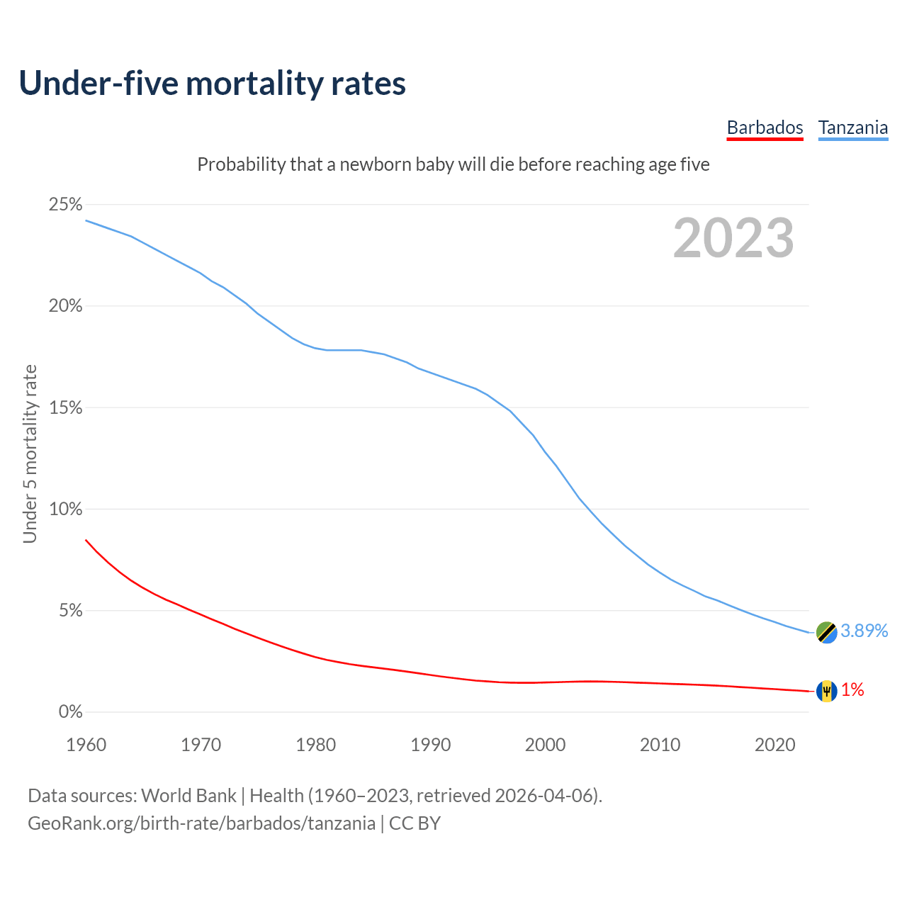 The chance that a newborn baby will die before reaching age five is 1% in Barbados and 3.89% in Tanzania. Above is a chart with historical data on under-five mortality rates.