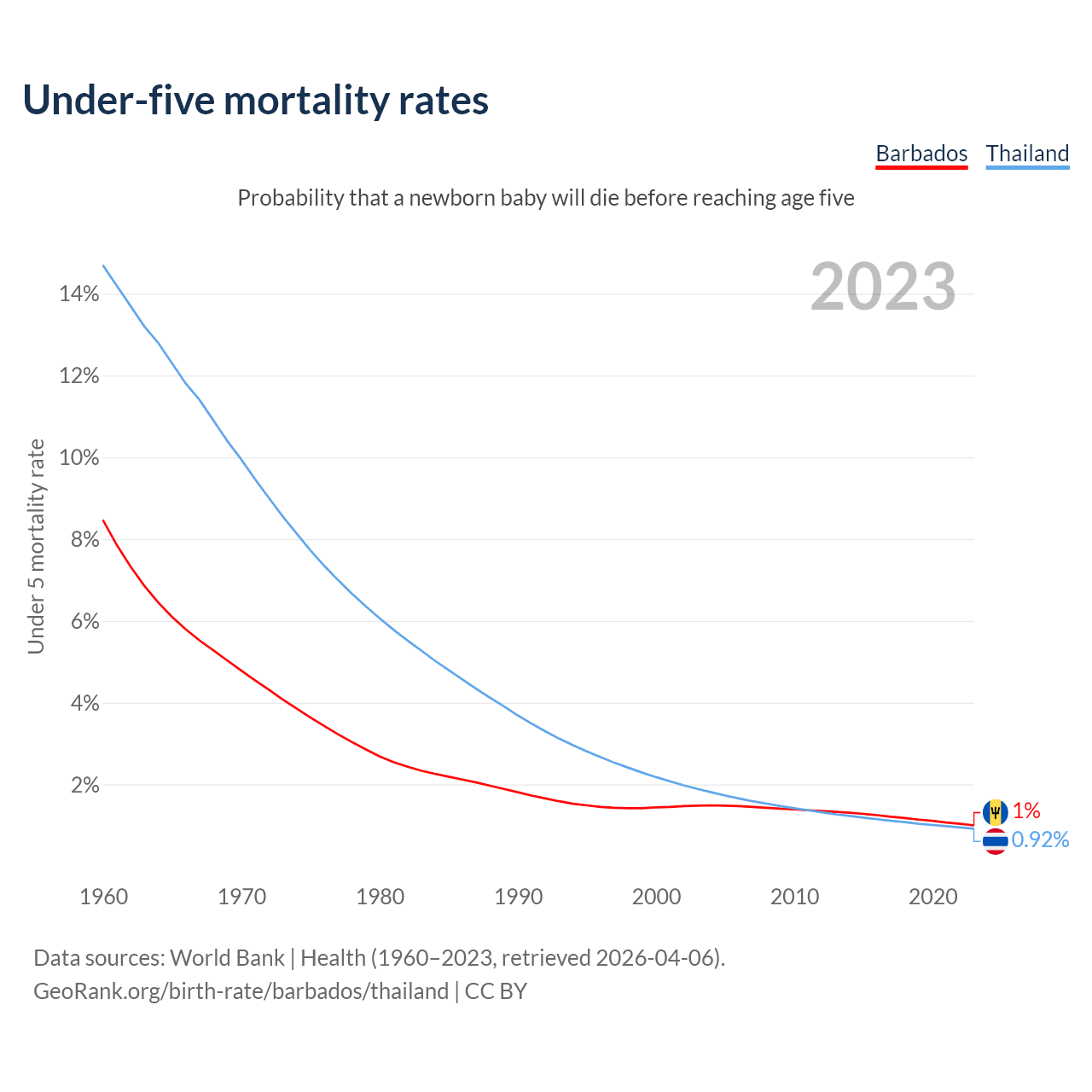 The chance that a newborn baby will die before reaching age five is 1% in Barbados and 0.92% in Thailand. Above is a chart with historical data on under-five mortality rates.