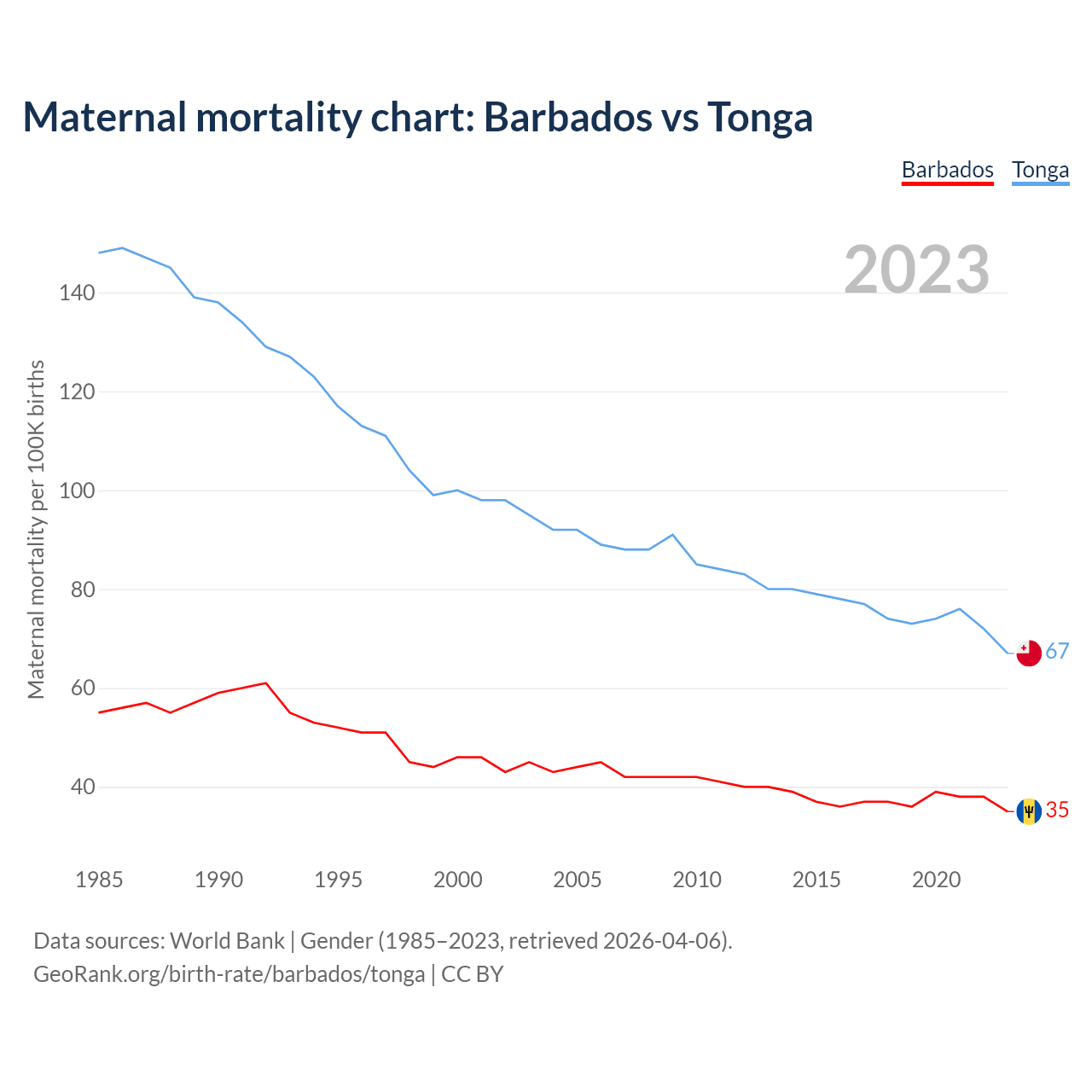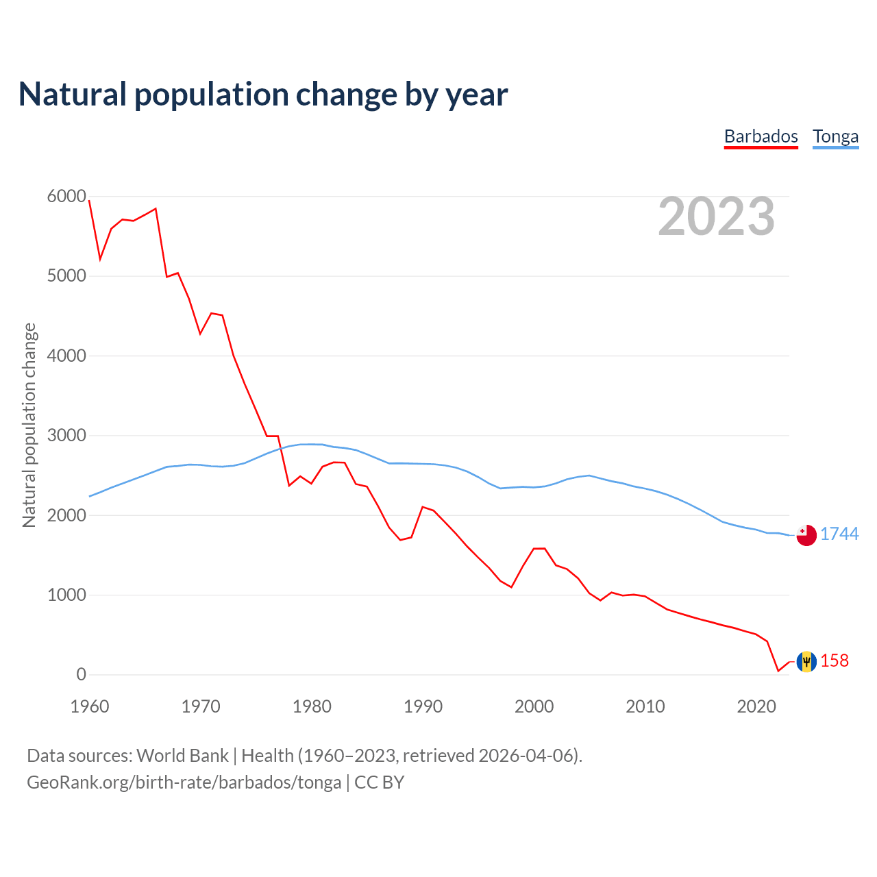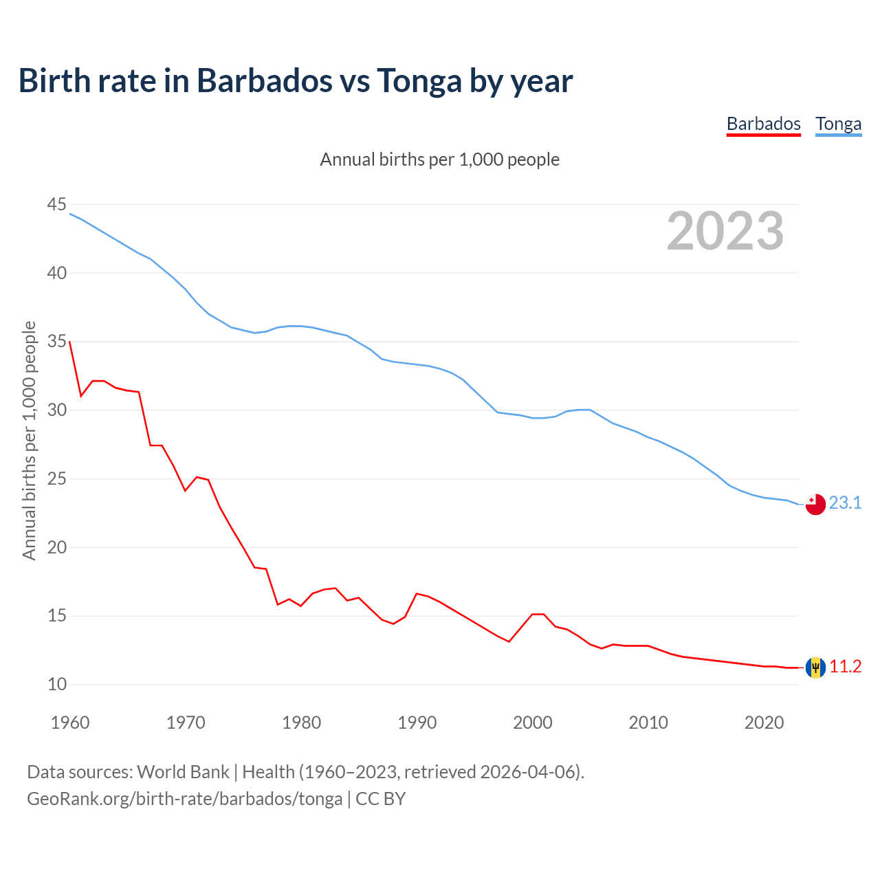 Barbados has an annual birth rate of 11.2 births per 1,000 people, compared to 23.1 for Tonga. The average number of children a woman is expected to have during her lifetime — the fertility rate, is 1.71 in Barbados and 3.13 in Tonga — 83.2% difference.