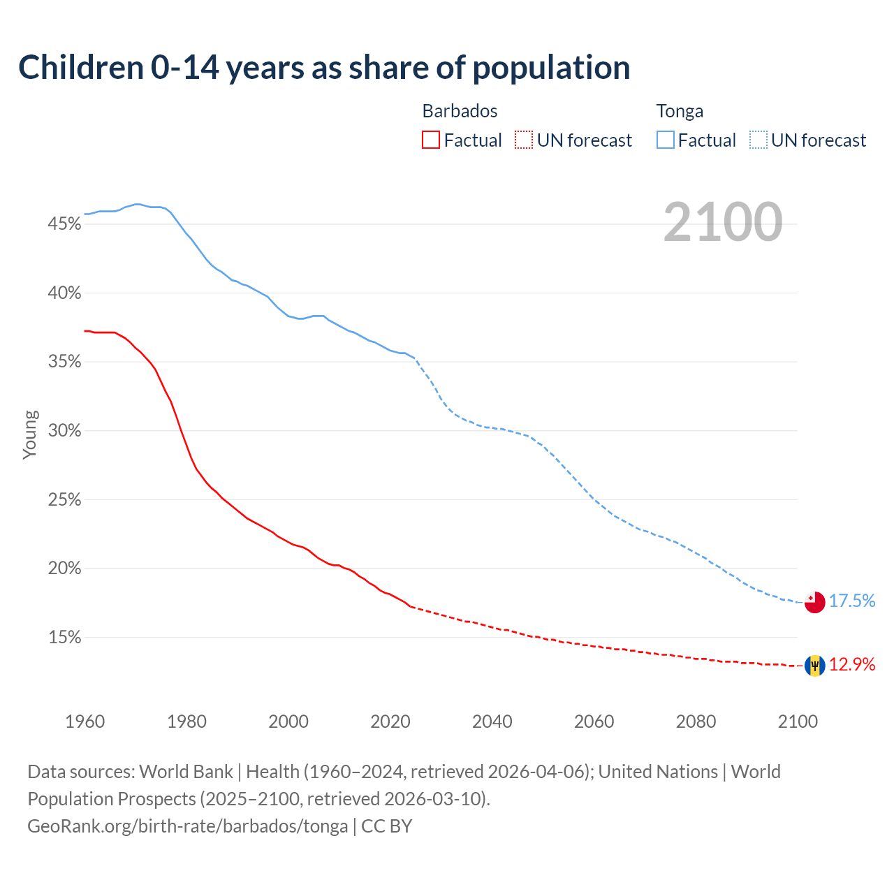 According to the latest available data on birth rates, the fertility rate in Barbados was 1.71 children per woman in 2023, compared to 3.13 in Tonga in 2023. The replacement level is considered to be 2.1 children per woman.