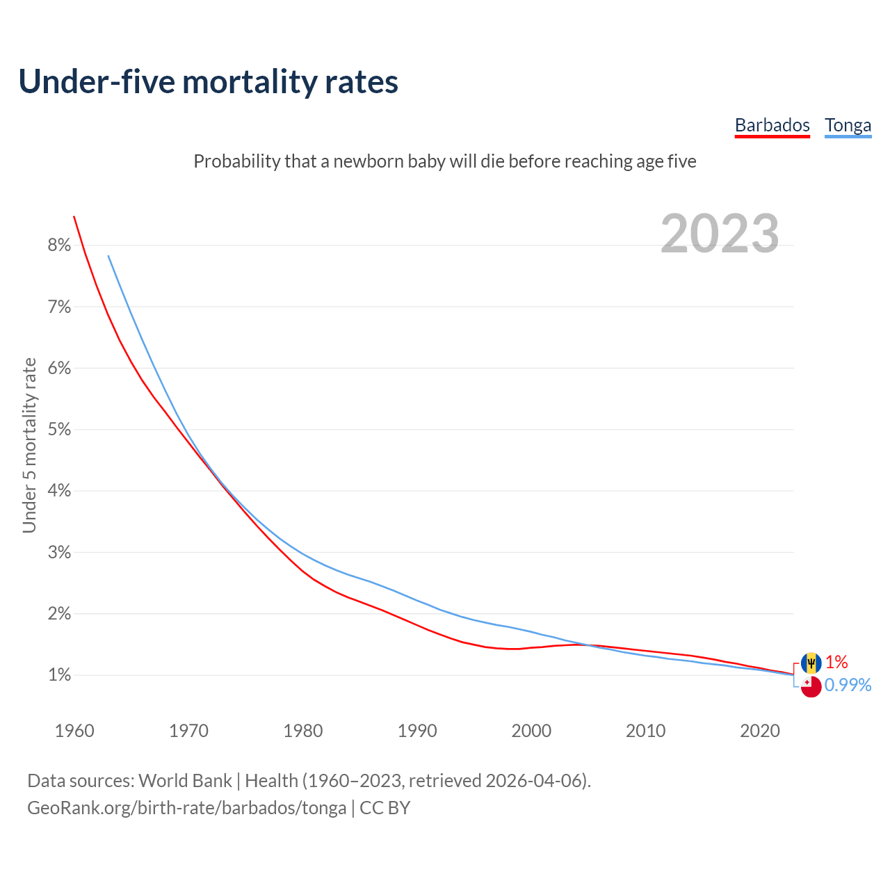 The chance that a newborn baby will die before reaching age five is 1% in Barbados and 0.99% in Tonga. Above is a chart with historical data on under-five mortality rates.