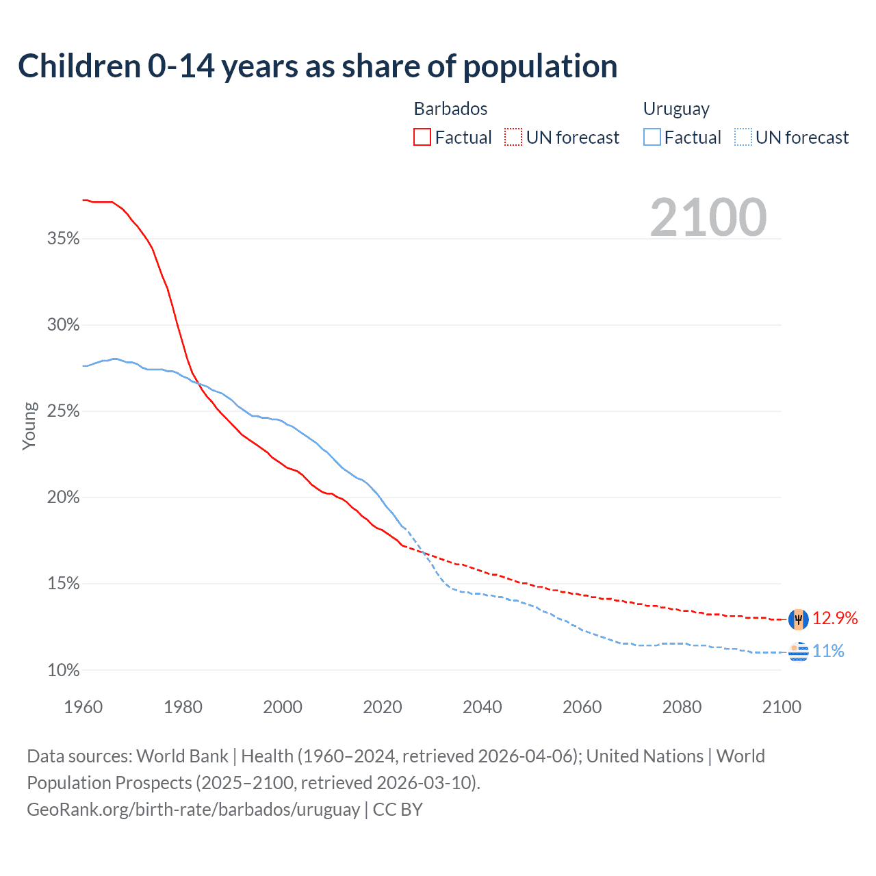 According to the latest available data on birth rates, the fertility rate in Barbados was 1.71 children per woman in 2023, compared to 1.41 in Uruguay in 2023. The replacement level is considered to be 2.1 children per woman.