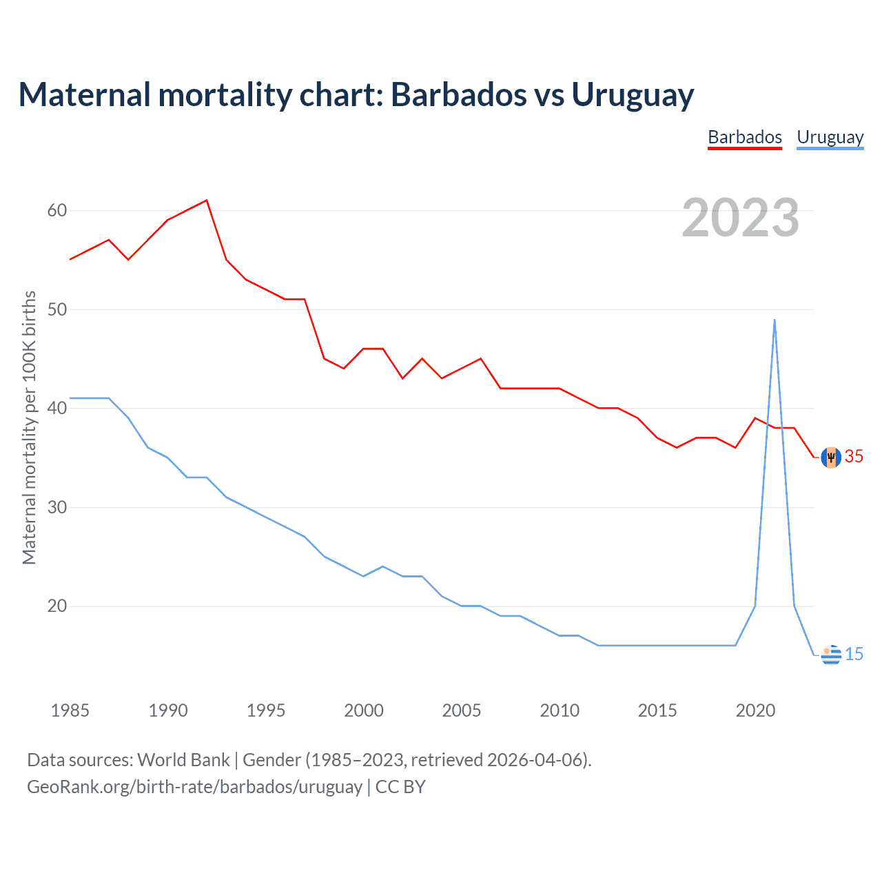 The maternal mortality rate, which is the probability of dying during childbirth or within 42 days of pregnancy termination, is 35 deaths per 100,000 live births in Barbados, compared to 15 deaths in Uruguay.