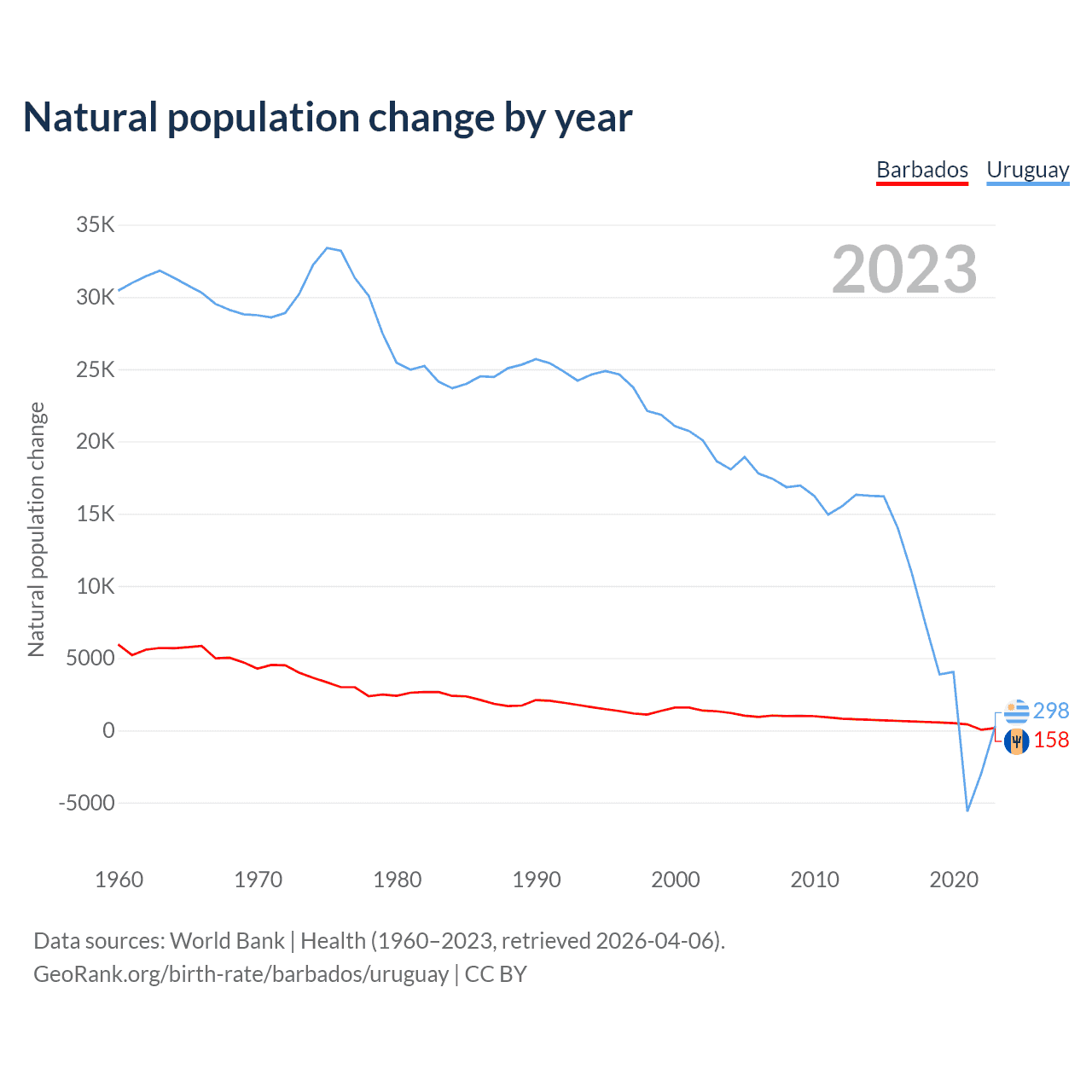 - Barbados is ranked 127/196 by birth rate compared to 149/196 for Uruguay.