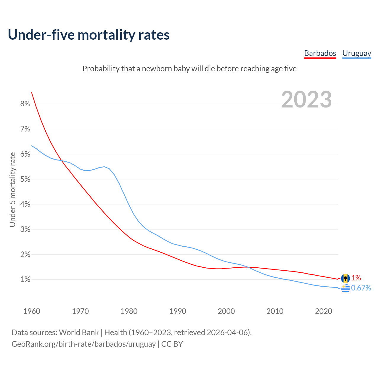 The chance that a newborn baby will die before reaching age five is 1% in Barbados and 0.67% in Uruguay. Above is a chart with historical data on under-five mortality rates.