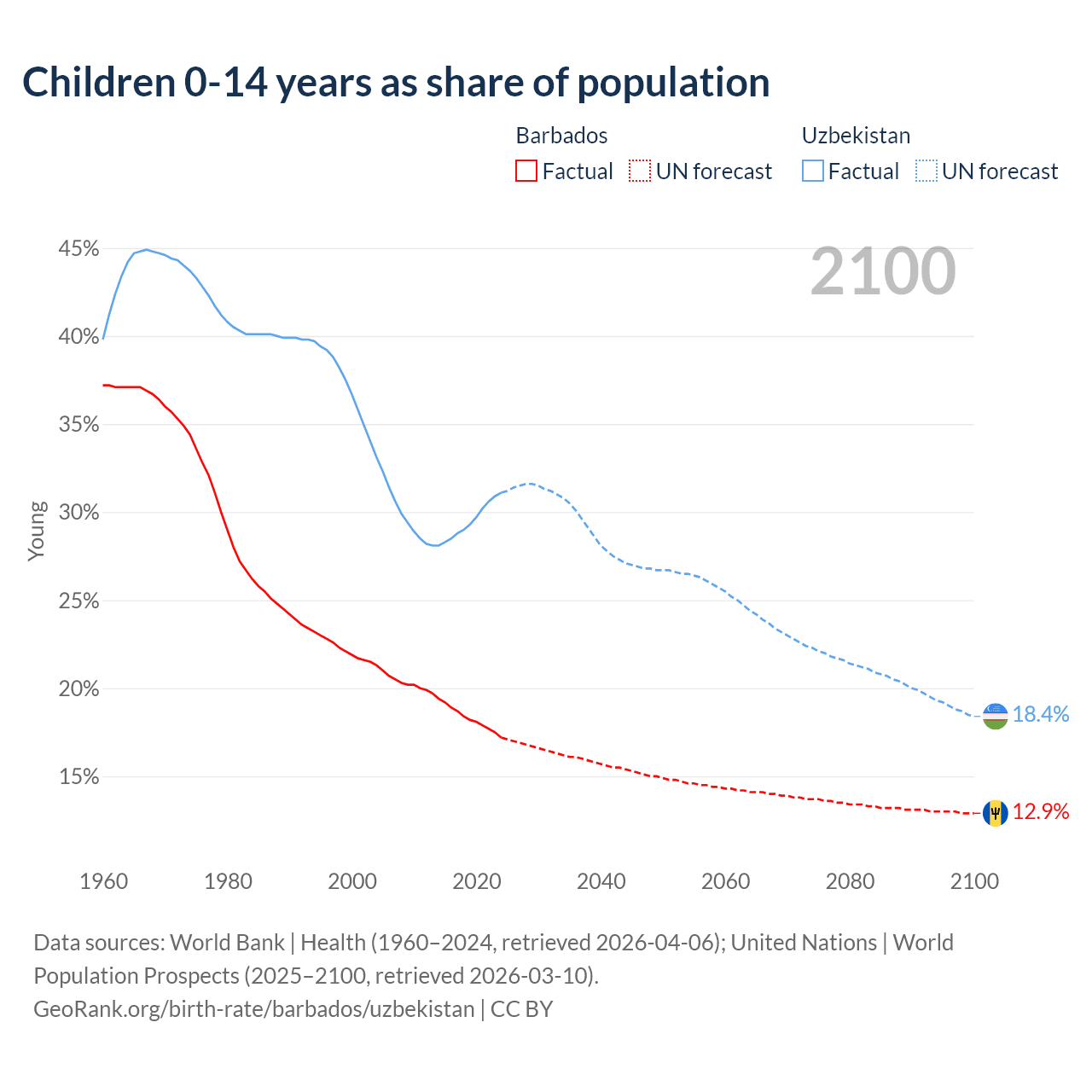 According to the latest available data on birth rates, the fertility rate in Barbados was 1.71 children per woman in 2023, compared to 3.5 in Uzbekistan in 2023. The replacement level is considered to be 2.1 children per woman.