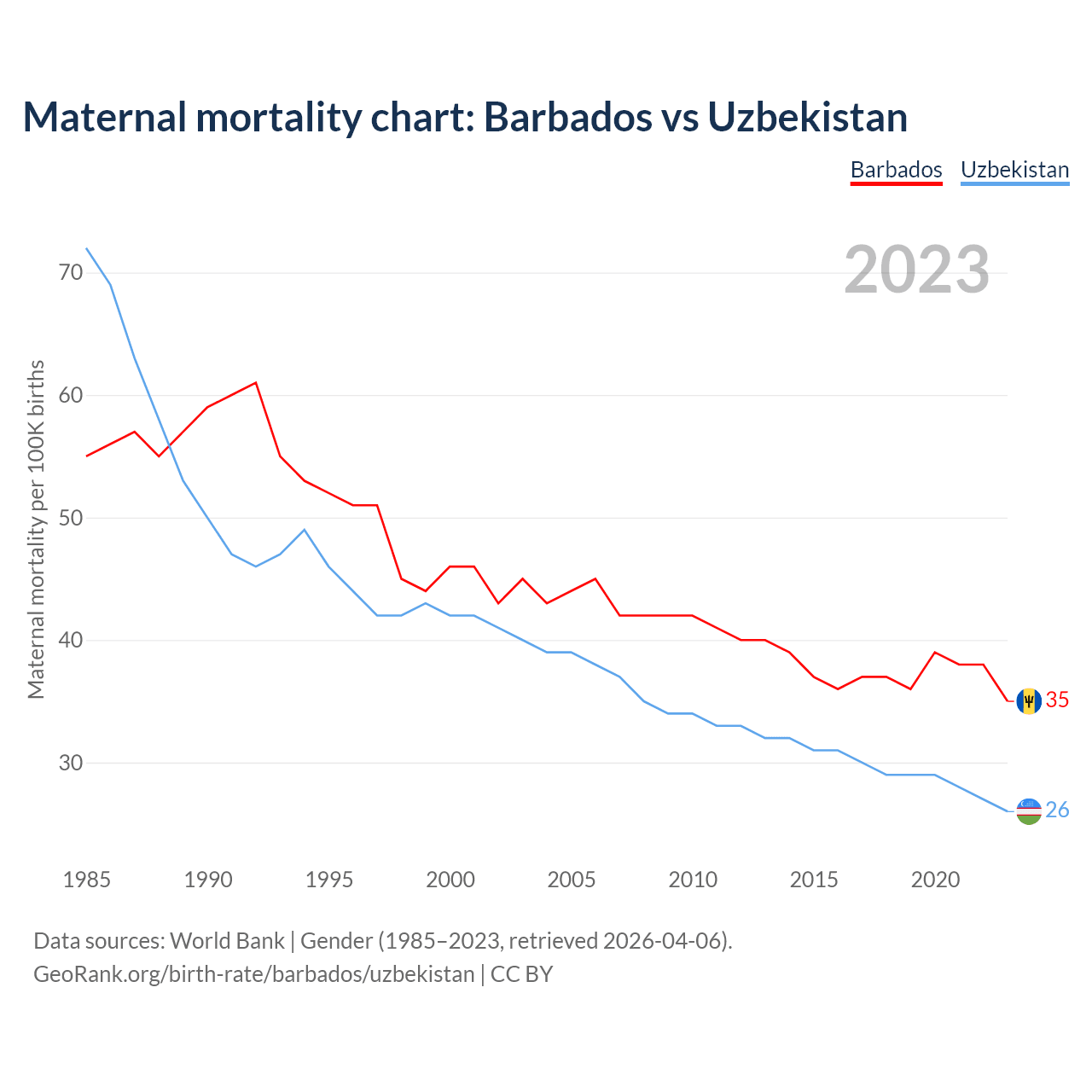 The maternal mortality rate, which is the probability of dying during childbirth or within 42 days of pregnancy termination, is 35 deaths per 100,000 live births in Barbados, compared to 26 deaths in Uzbekistan.