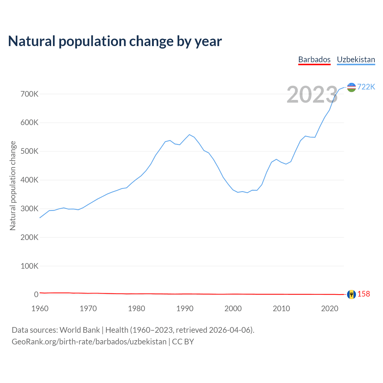 Barbados has an annual birth rate of 11.2 births per 1,000 people, compared to 26.5 for Uzbekistan. The average number of children a woman is expected to have during her lifetime — the fertility rate, is 1.71 in Barbados and 3.5 in Uzbekistan — 104.9% difference.