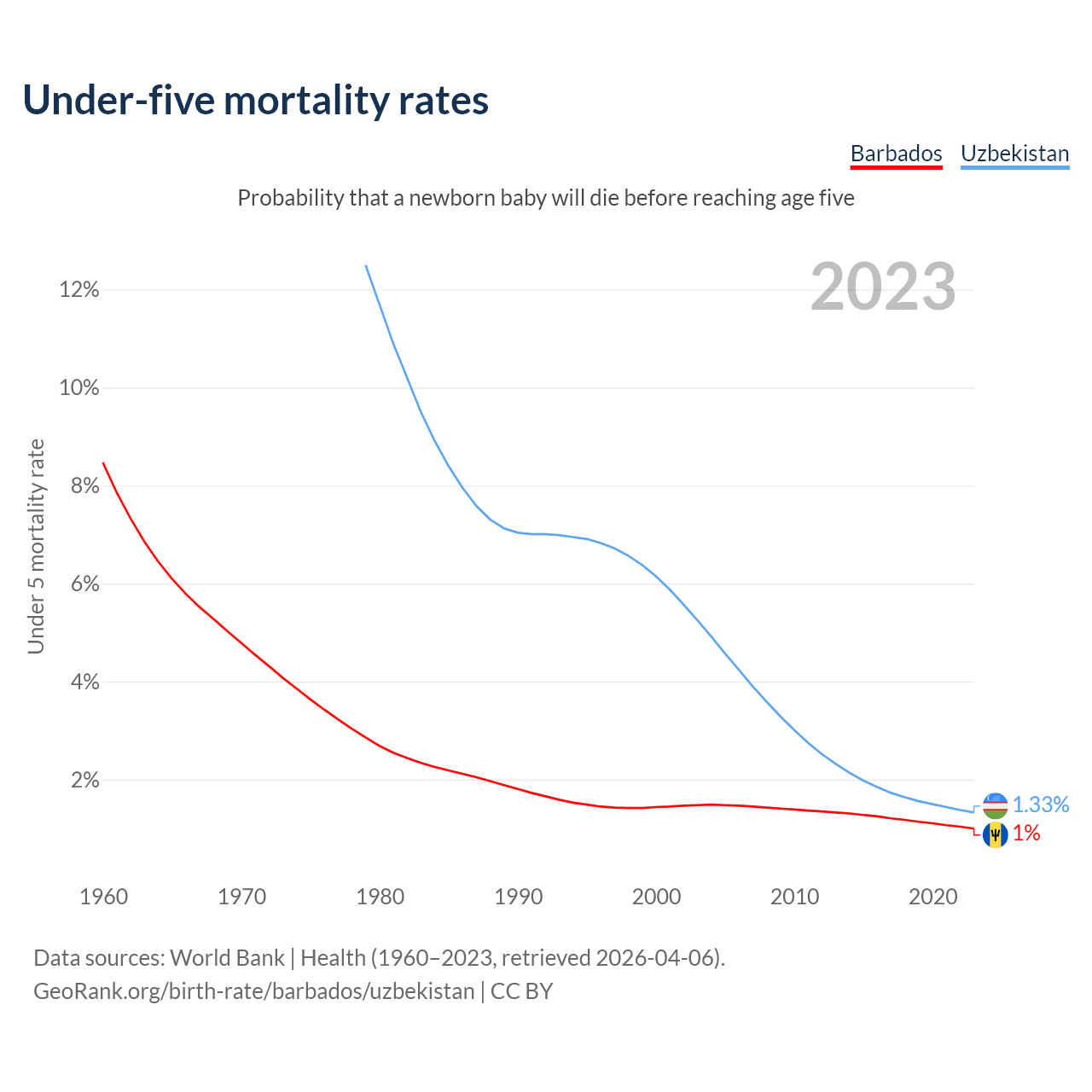 The chance that a newborn baby will die before reaching age five is 1% in Barbados and 1.33% in Uzbekistan. Above is a chart with historical data on under-five mortality rates.