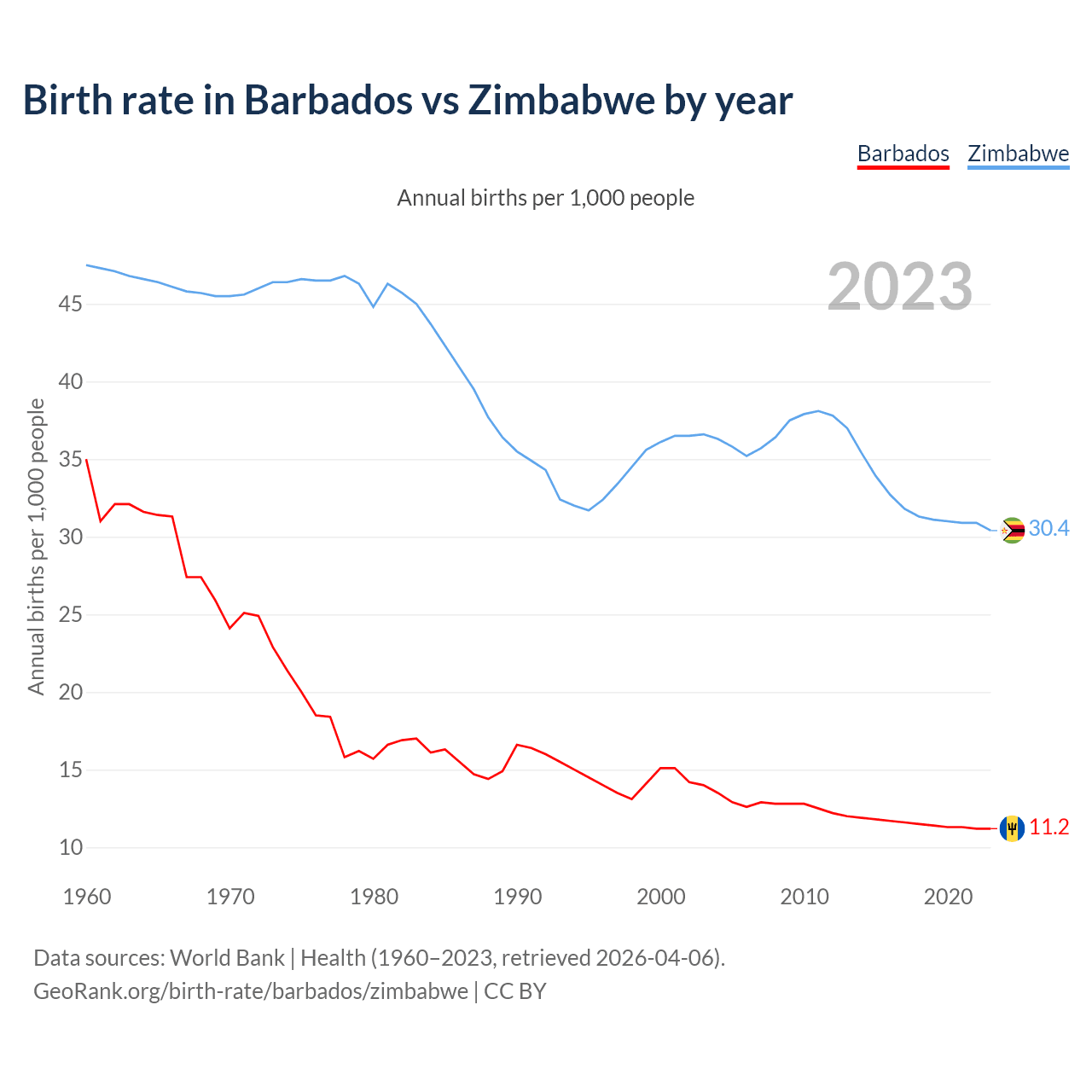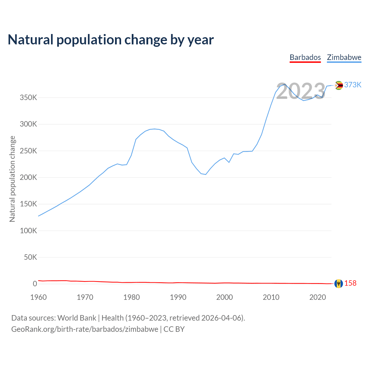 Barbados has an annual birth rate of 11.2 births per 1,000 people, compared to 30.4 for Zimbabwe. The average number of children a woman is expected to have during her lifetime — the fertility rate, is 1.71 in Barbados and 3.72 in Zimbabwe — 118% difference.