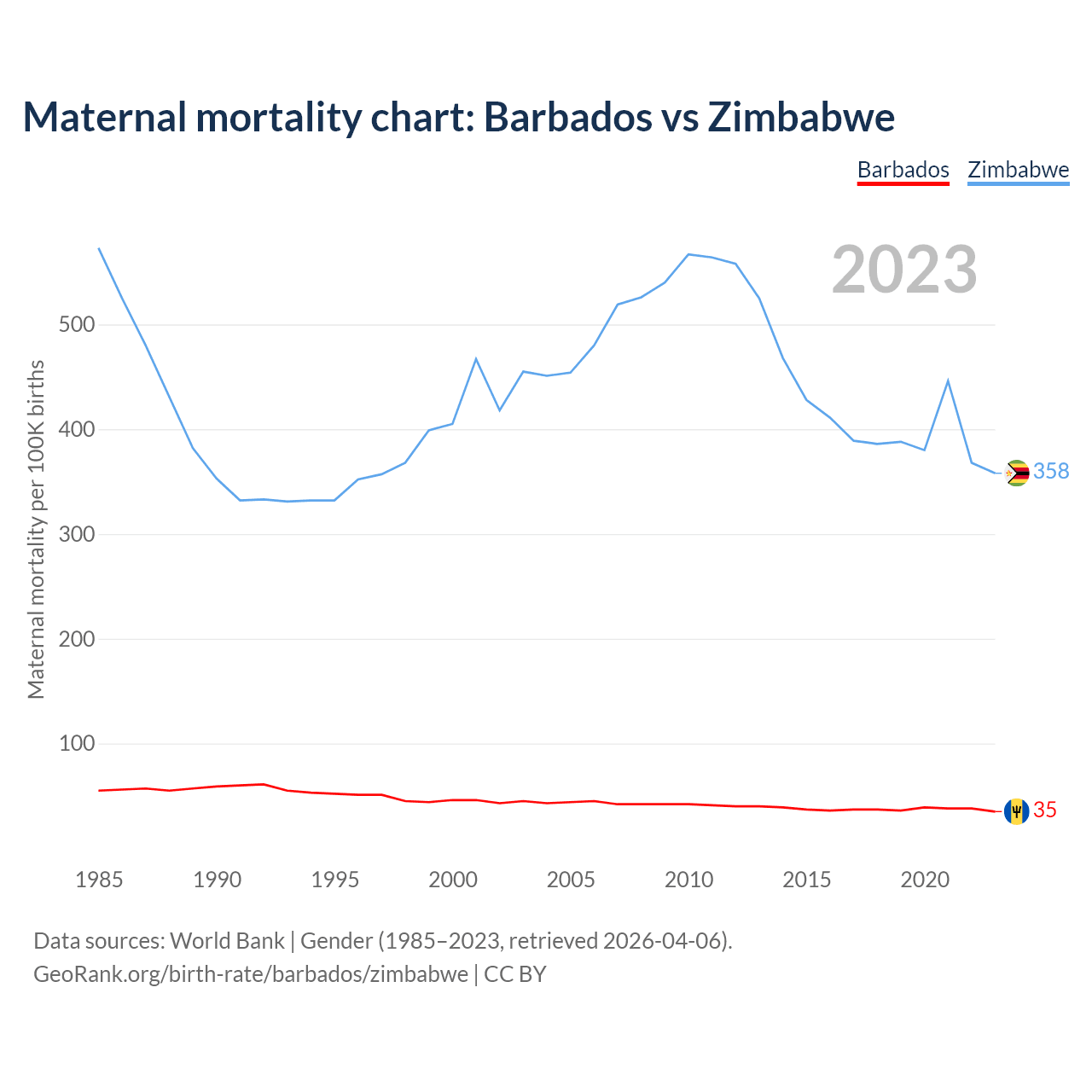 The maternal mortality rate, which is the probability of dying during childbirth or within 42 days of pregnancy termination, is 35 deaths per 100,000 live births in Barbados, compared to 358 deaths in Zimbabwe.