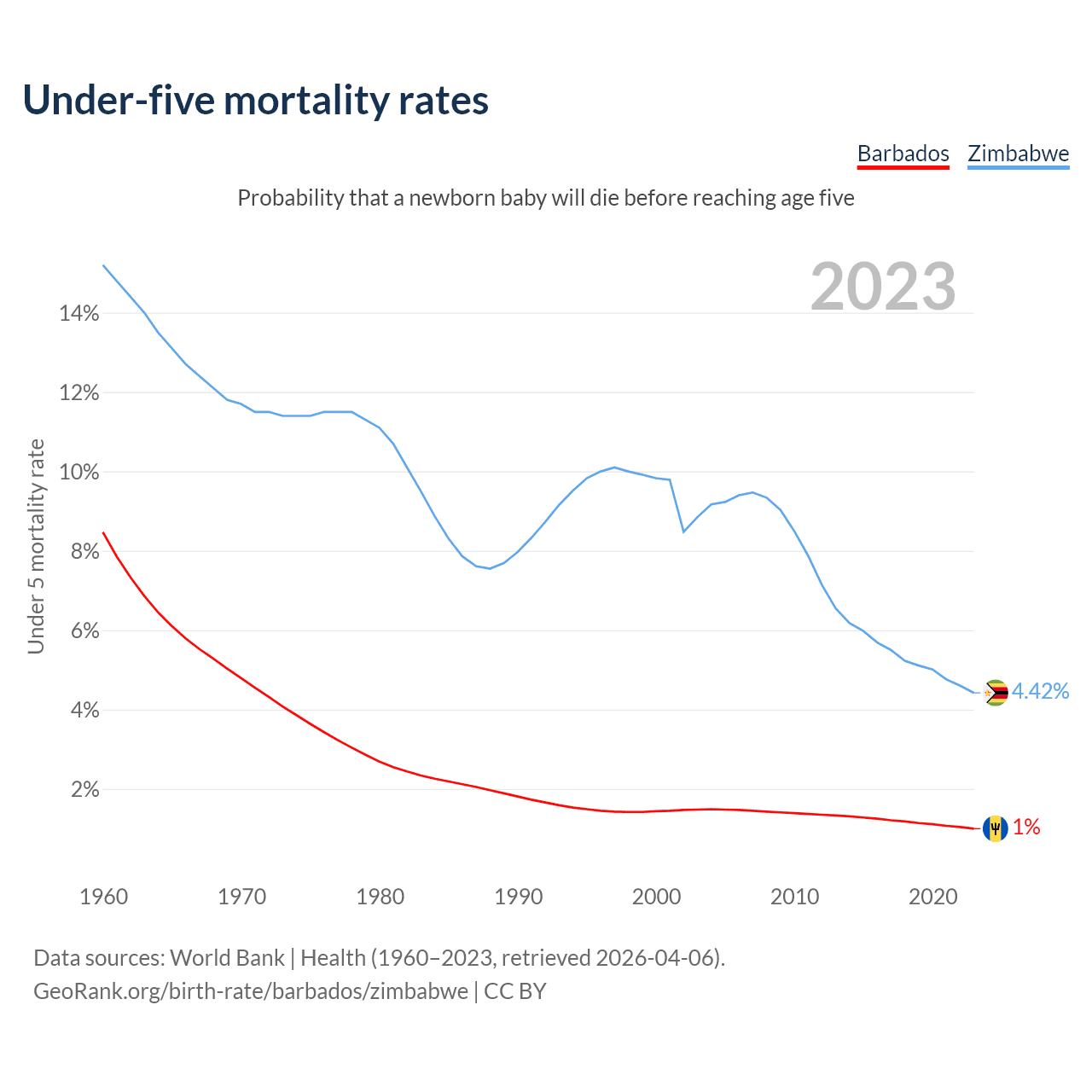 The chance that a newborn baby will die before reaching age five is 1% in Barbados and 4.42% in Zimbabwe. Above is a chart with historical data on under-five mortality rates.