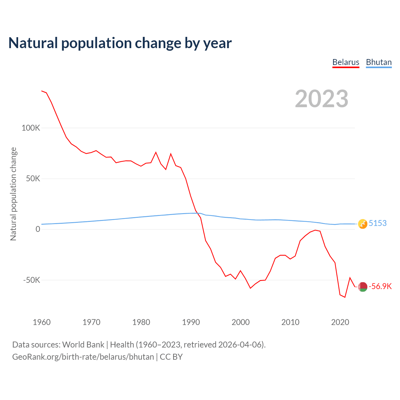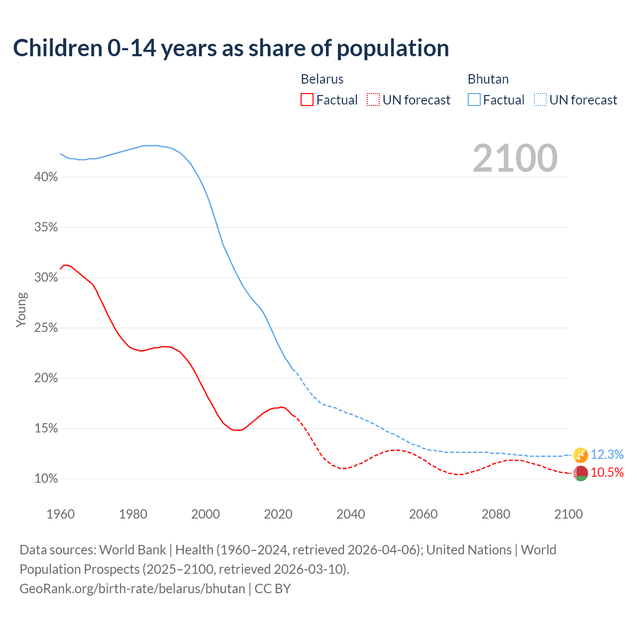 Belarus has an annual birth rate of 7.14 births per 1,000 people, compared to 12.7 for Bhutan. The average number of children a woman is expected to have during her lifetime — the fertility rate, is 1.21 in Belarus and 1.46 in Bhutan — 21% difference.