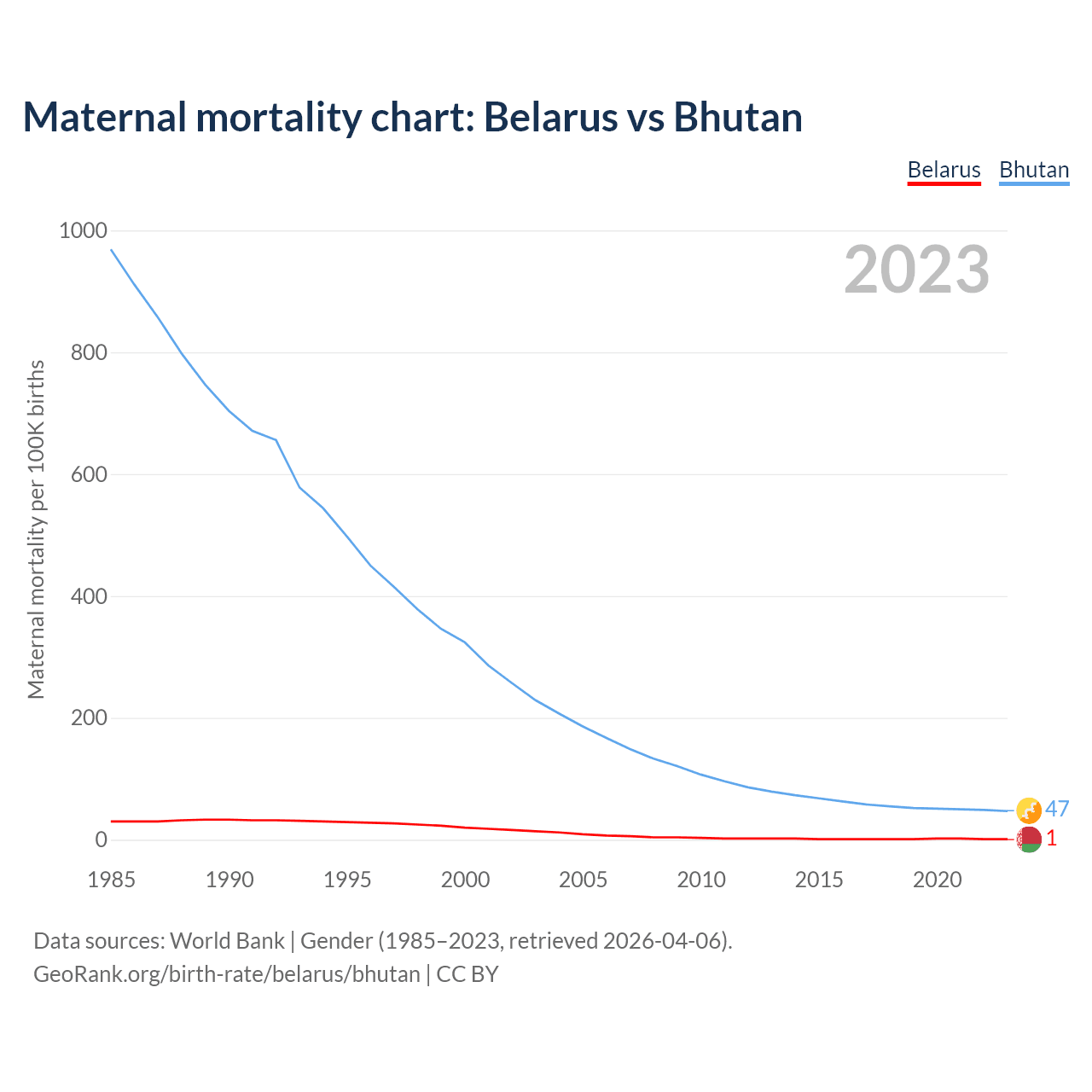 The maternal mortality rate, which is the probability of dying during childbirth or within 42 days of pregnancy termination, is 1 deaths per 100,000 live births in Belarus, compared to 47 deaths in Bhutan.