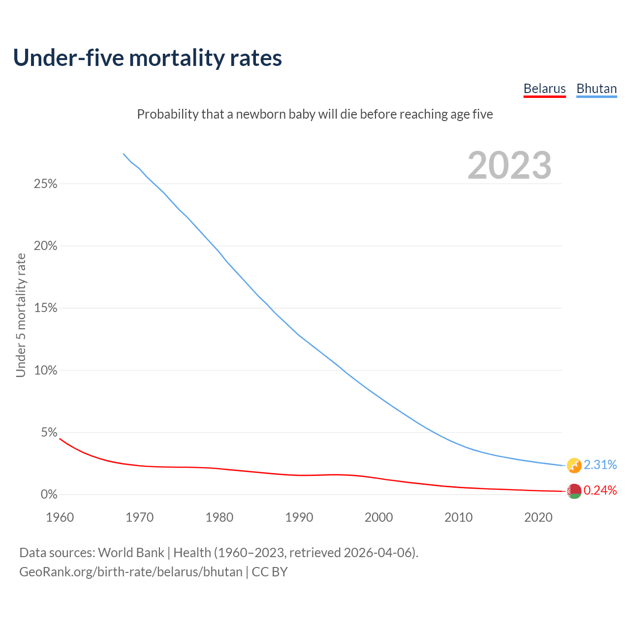 The chance that a newborn baby will die before reaching age five is 0.24% in Belarus and 2.31% in Bhutan. Above is a chart with historical data on under-five mortality rates.