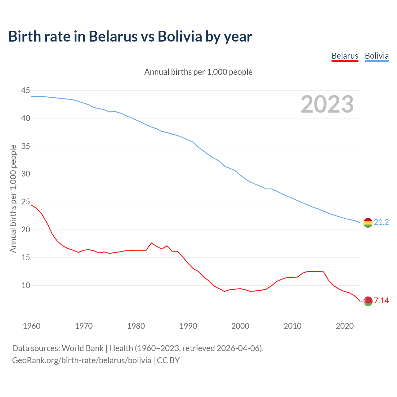 Belarus has an annual birth rate of 7.14 births per 1,000 people, compared to 21.2 for Bolivia. The average number of children a woman is expected to have during her lifetime — the fertility rate, is 1.21 in Belarus and 2.55 in Bolivia — 110.8% difference.
