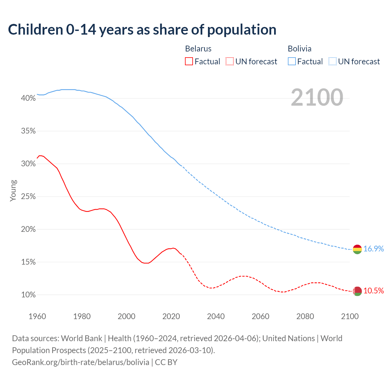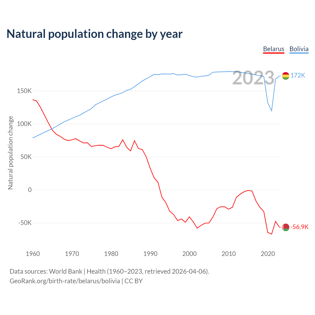 According to the latest available data on birth rates, the fertility rate in Belarus was 1.21 children per woman in 2023, compared to 2.55 in Bolivia in 2023. The replacement level is considered to be 2.1 children per woman.