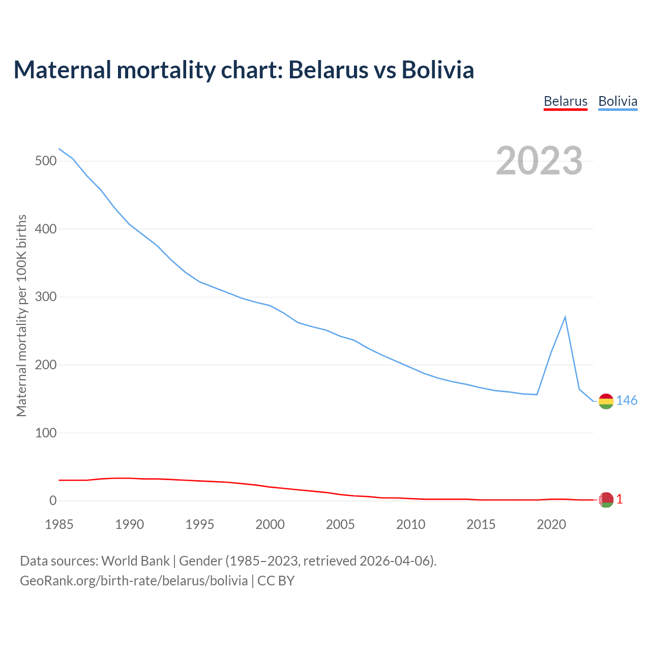 The maternal mortality rate, which is the probability of dying during childbirth or within 42 days of pregnancy termination, is 1 deaths per 100,000 live births in Belarus, compared to 146 deaths in Bolivia.
