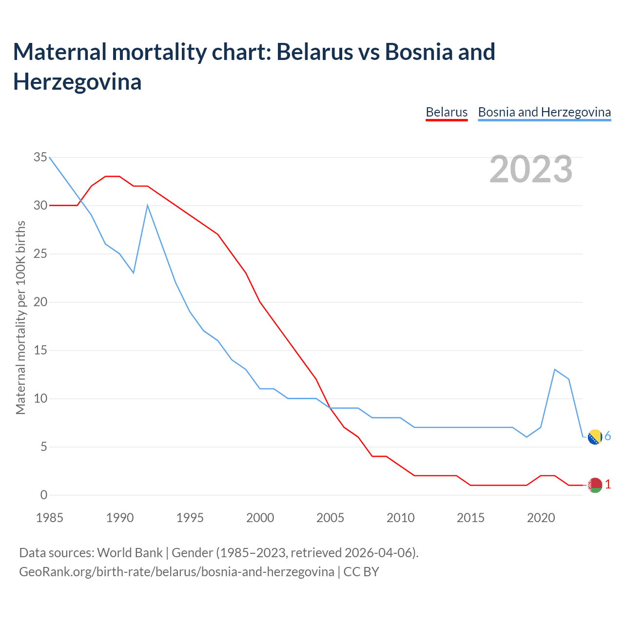 The maternal mortality rate, which is the probability of dying during childbirth or within 42 days of pregnancy termination, is 1 deaths per 100,000 live births in Belarus, compared to 6 deaths in Bosnia and Herzegovina.