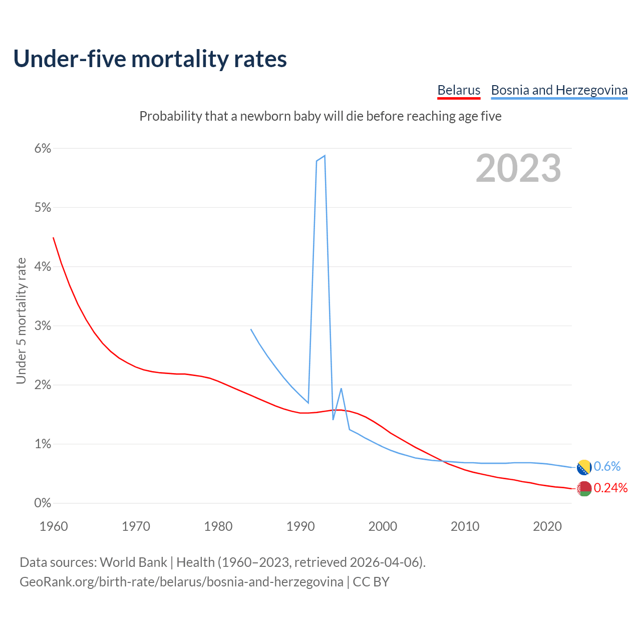 The chance that a newborn baby will die before reaching age five is 0.24% in Belarus and 0.6% in Bosnia and Herzegovina. Above is a chart with historical data on under-five mortality rates.