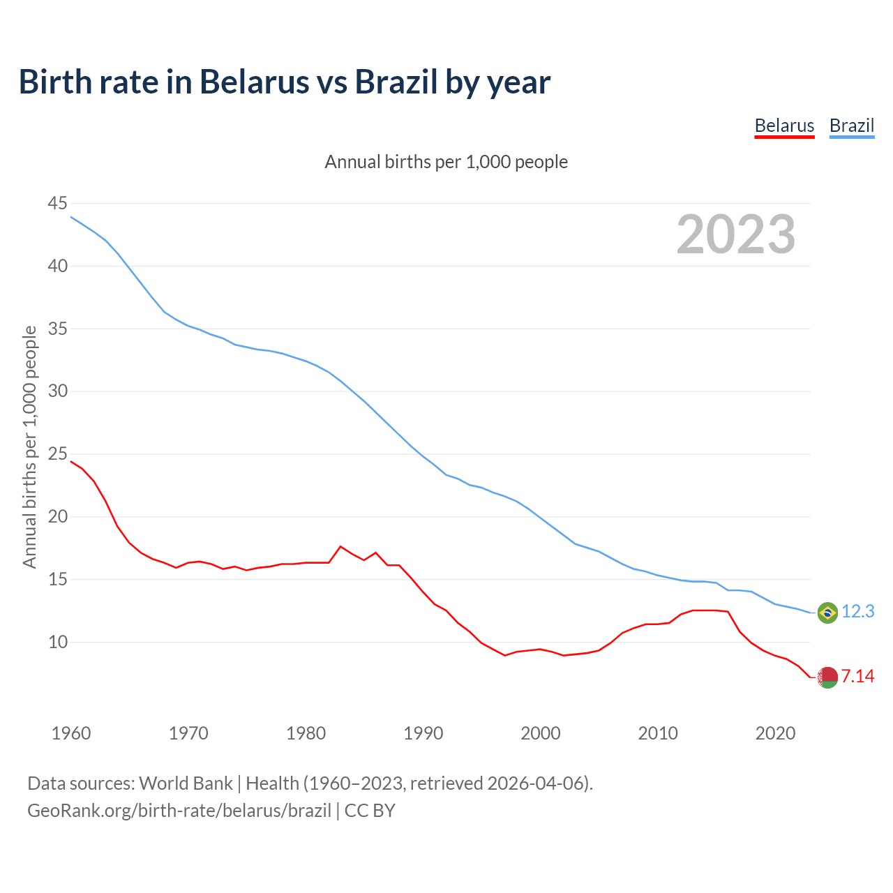 Belarus has an annual birth rate of 7.14 births per 1,000 people, compared to 12.3 for Brazil. The average number of children a woman is expected to have during her lifetime — the fertility rate, is 1.21 in Belarus and 1.62 in Brazil — 34% difference.