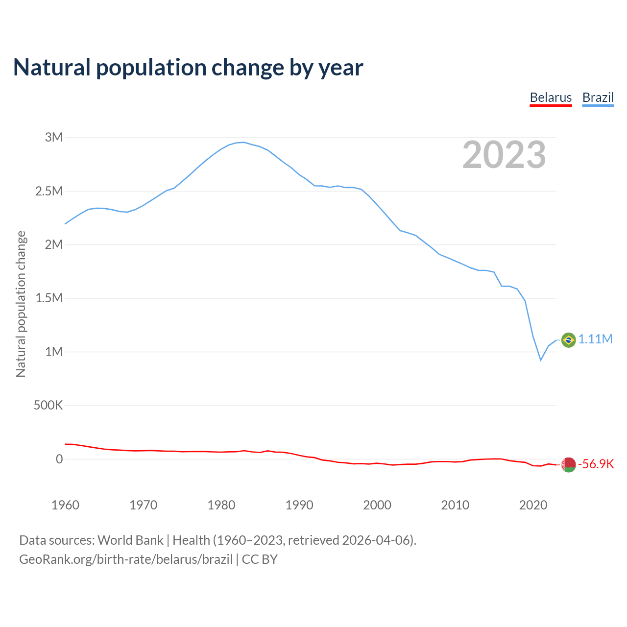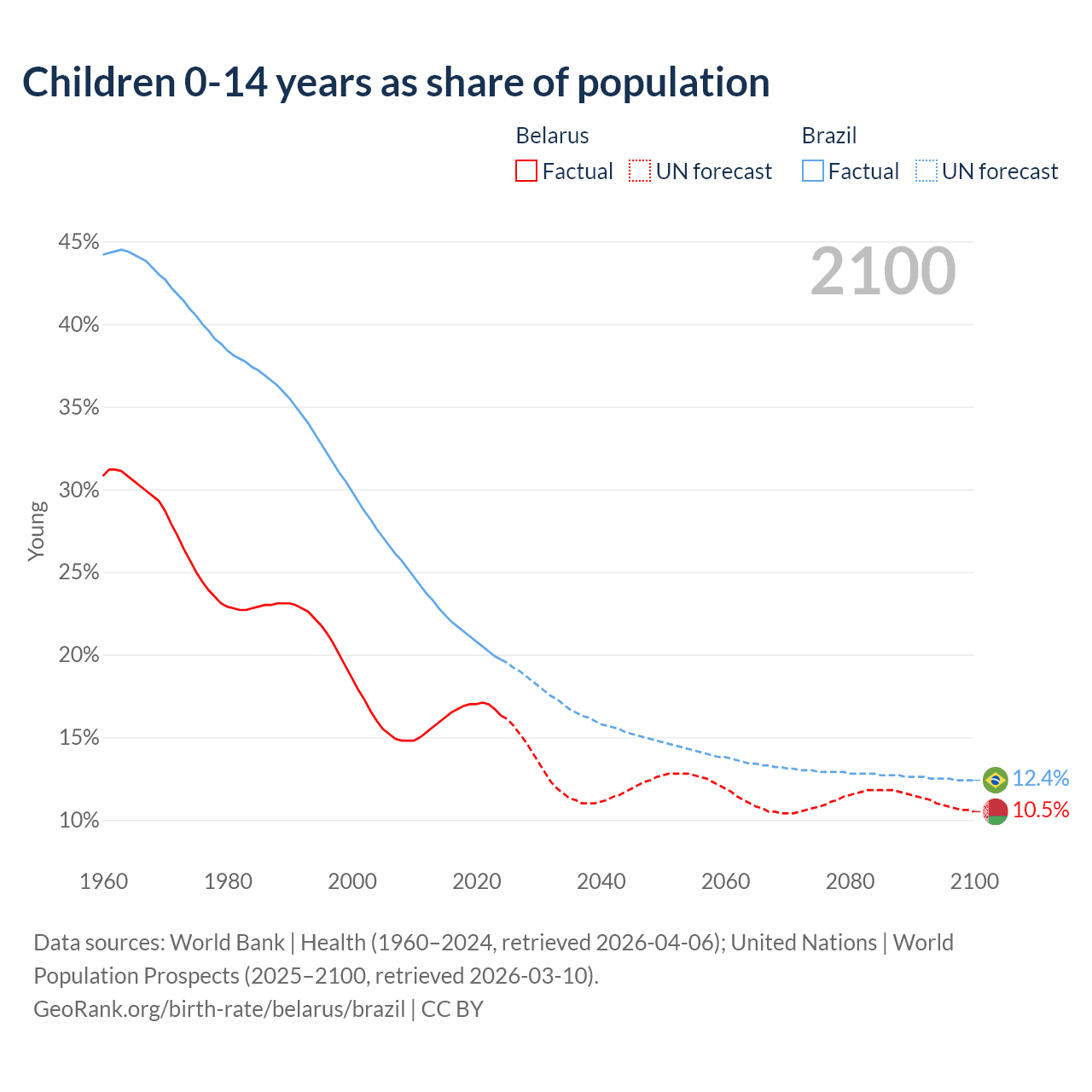According to the latest available data on birth rates, the fertility rate in Belarus was 1.21 children per woman in 2023, compared to 1.62 in Brazil in 2023. The replacement level is considered to be 2.1 children per woman.