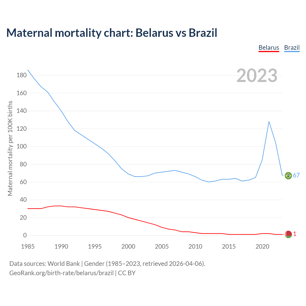 The maternal mortality rate, which is the probability of dying during childbirth or within 42 days of pregnancy termination, is 1 deaths per 100,000 live births in Belarus, compared to 67 deaths in Brazil.