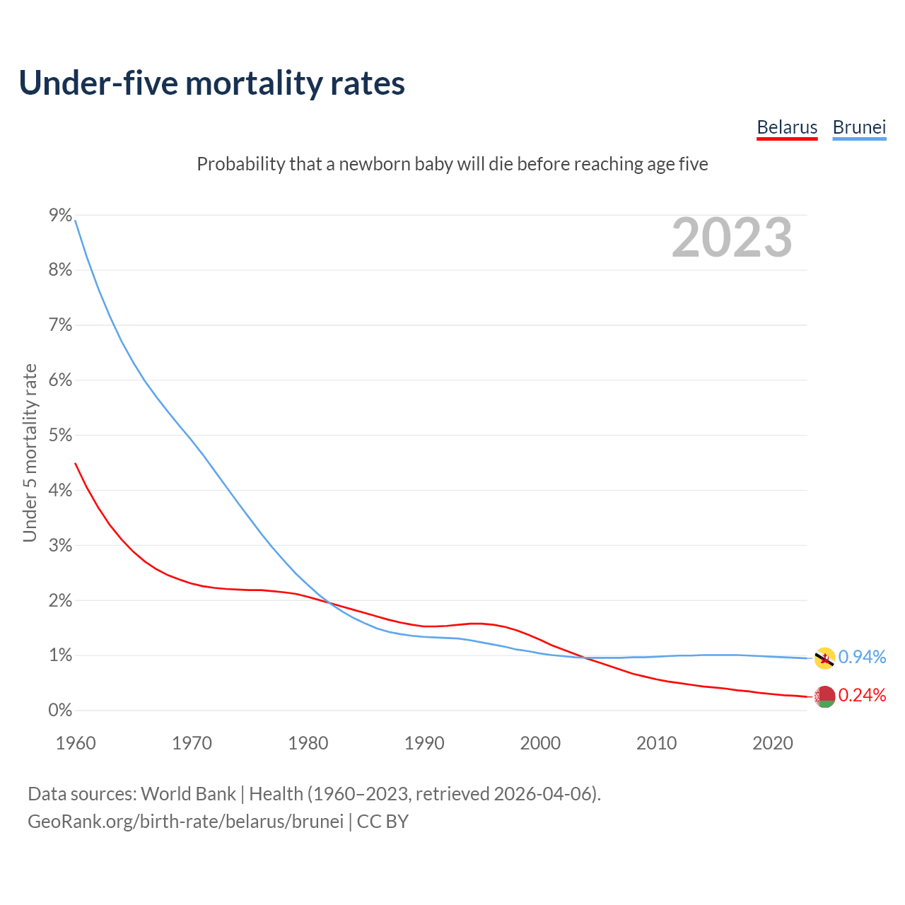 The chance that a newborn baby will die before reaching age five is 0.24% in Belarus and 0.94% in Brunei. Above is a chart with historical data on under-five mortality rates.