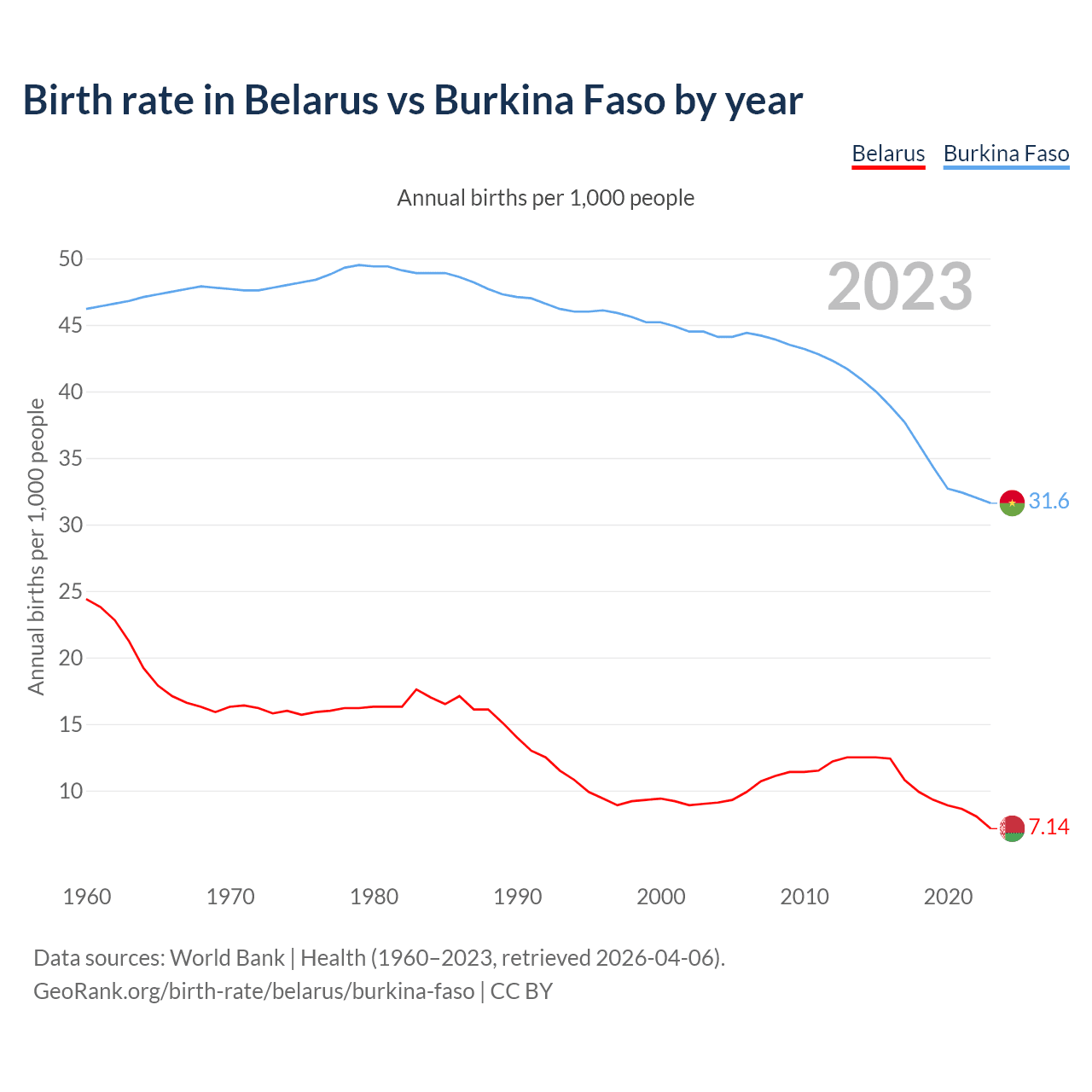 Belarus has an annual birth rate of 7.14 births per 1,000 people, compared to 31.6 for Burkina Faso. The average number of children a woman is expected to have during her lifetime — the fertility rate, is 1.21 in Belarus and 4.19 in Burkina Faso — 246.5% difference.