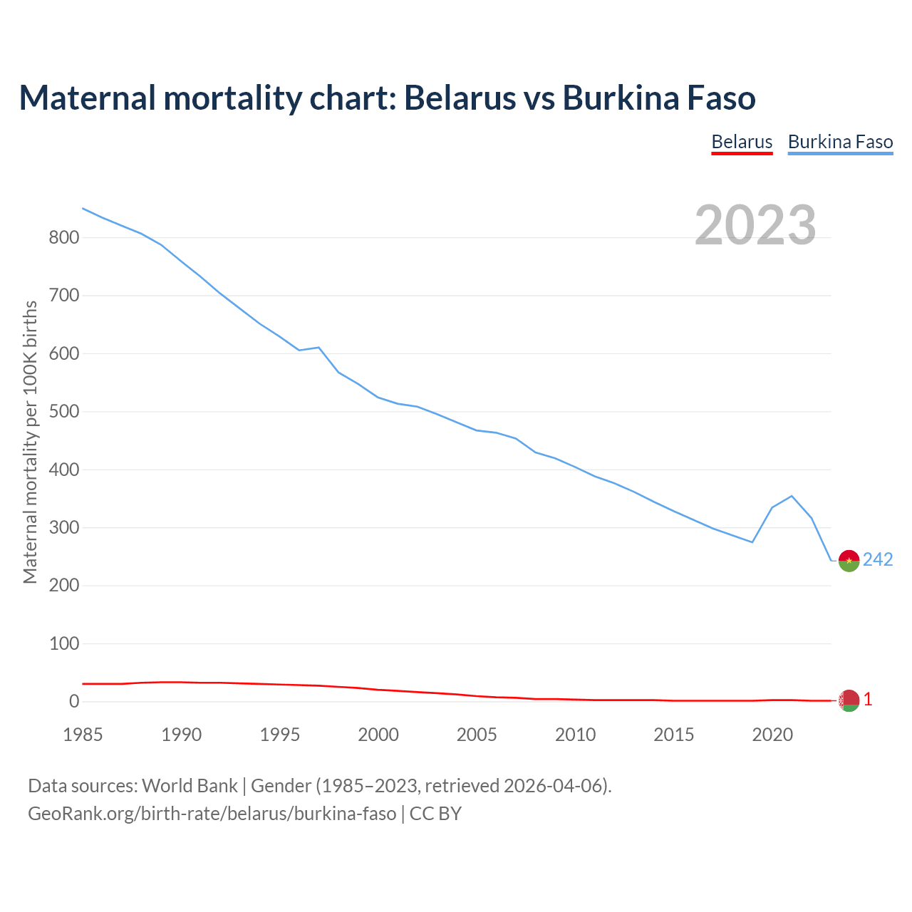 The maternal mortality rate, which is the probability of dying during childbirth or within 42 days of pregnancy termination, is 1 deaths per 100,000 live births in Belarus, compared to 242 deaths in Burkina Faso.