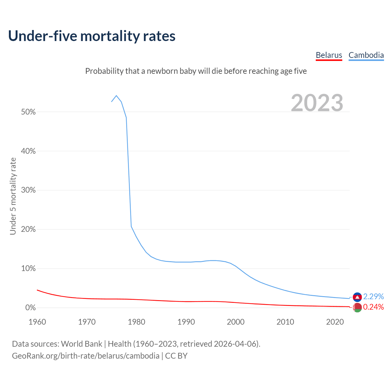 The chance that a newborn baby will die before reaching age five is 0.24% in Belarus and 2.29% in Cambodia. Above is a chart with historical data on under-five mortality rates.