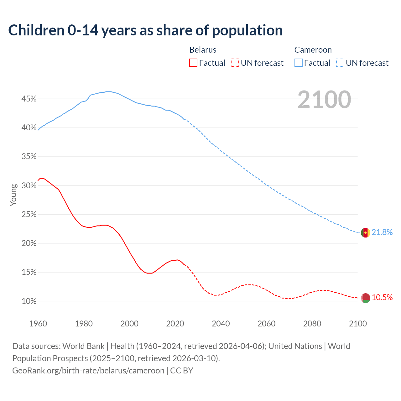 Belarus has an annual birth rate of 7.14 births per 1,000 people, compared to 33.7 for Cameroon. The average number of children a woman is expected to have during her lifetime — the fertility rate, is 1.21 in Belarus and 4.32 in Cameroon — 257.8% difference.