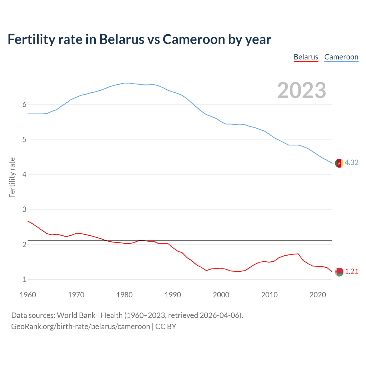 According to the latest available data on birth rates, the fertility rate in Belarus was 1.21 children per woman in 2023, compared to 4.32 in Cameroon in 2023. The replacement level is considered to be 2.1 children per woman.
