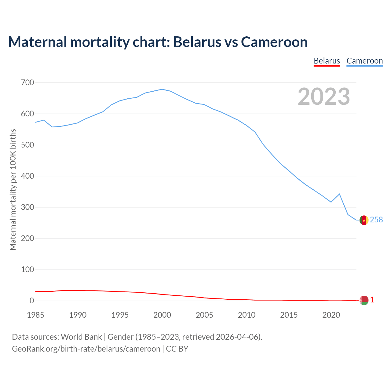 The maternal mortality rate, which is the probability of dying during childbirth or within 42 days of pregnancy termination, is 1 deaths per 100,000 live births in Belarus, compared to 258 deaths in Cameroon.