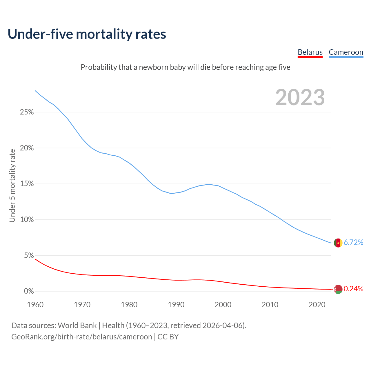 The chance that a newborn baby will die before reaching age five is 0.24% in Belarus and 6.72% in Cameroon. Above is a chart with historical data on under-five mortality rates.