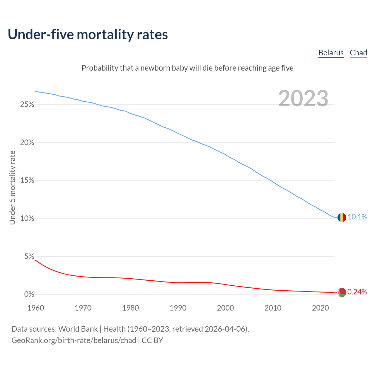 The chance that a newborn baby will die before reaching age five is 0.24% in Belarus and 10.1% in Chad. Above is a chart with historical data on under-five mortality rates.