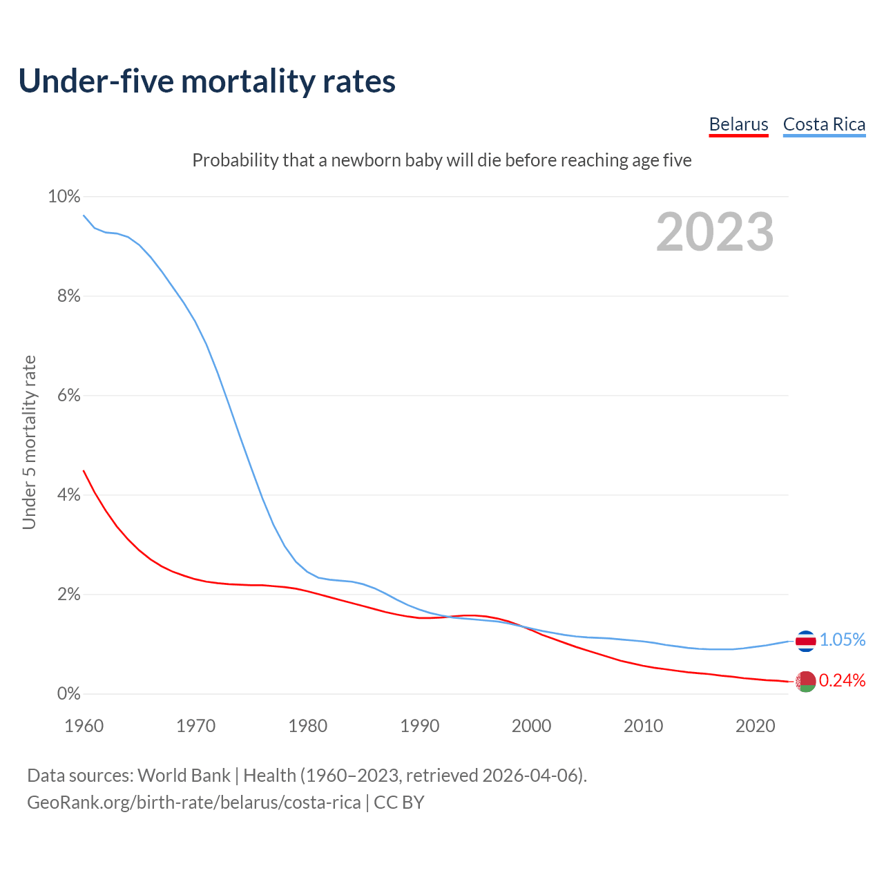 The chance that a newborn baby will die before reaching age five is 0.24% in Belarus and 1.05% in Costa Rica. Above is a chart with historical data on under-five mortality rates.