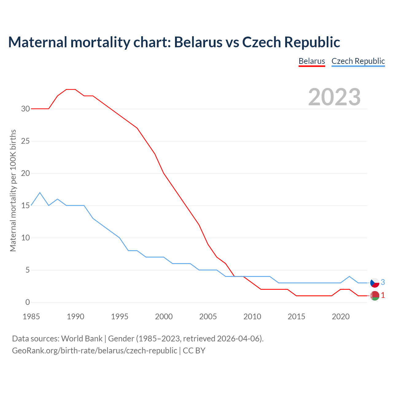 The maternal mortality rate, which is the probability of dying during childbirth or within 42 days of pregnancy termination, is 1 deaths per 100,000 live births in Belarus, compared to 3 deaths in the Czech Republic.